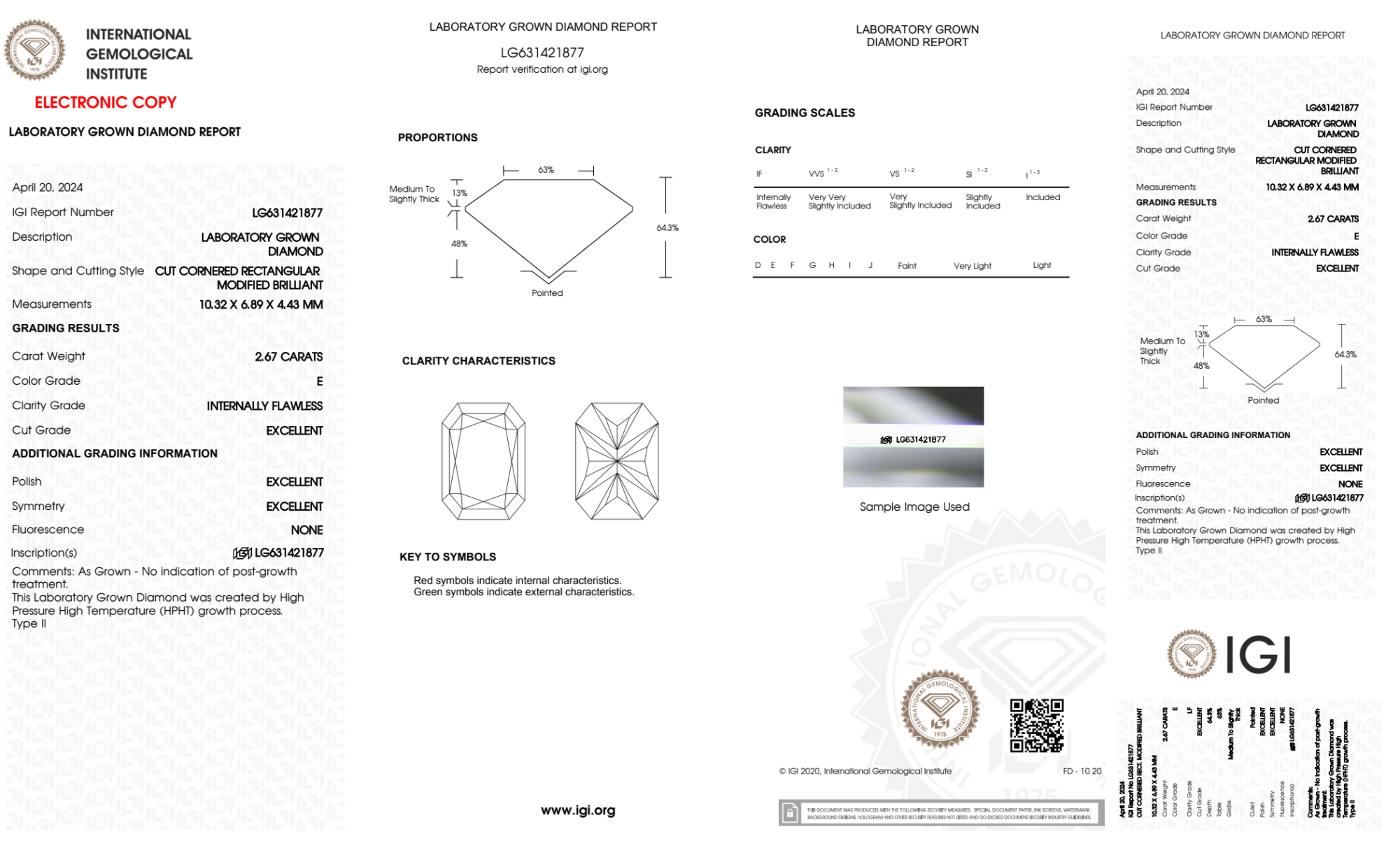 Your 2.67 carat Radiant lab diamond is graded E color (Colorless), and you can read more about E color diamonds here.