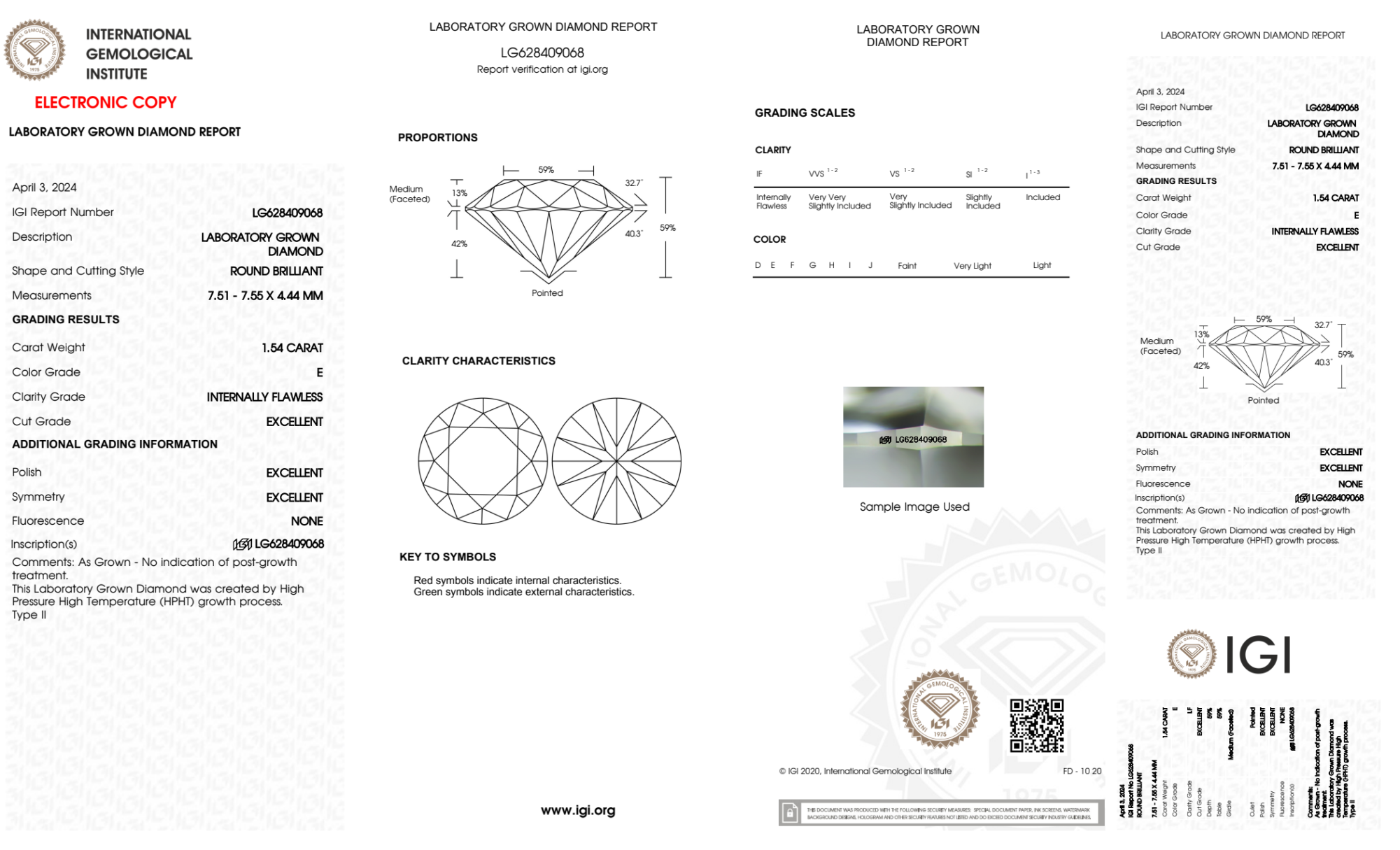 Your 1.54 carat Round lab diamond is graded IF clarity, which stands for Internally Flawless. Read more about IF clarity diamonds here, or learn more about diamond clarity in general here.