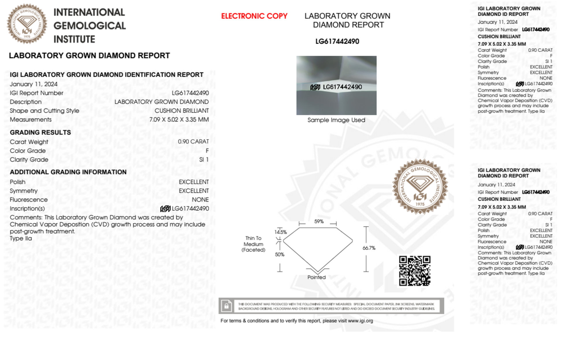 Your 0.90 carat Cushion lab diamond is graded F color (Colorless), and you can read more about F color diamonds here.