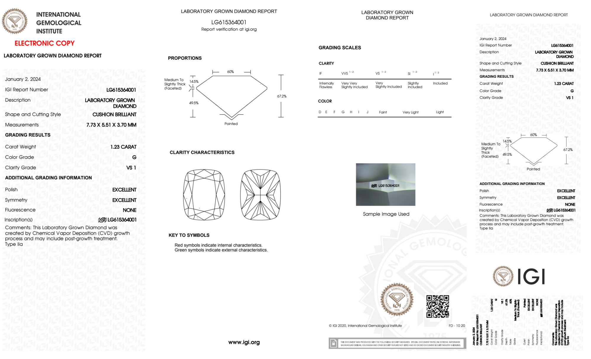 Your 1.23 carat Cushion lab diamond is graded G color (Near Colorless), and you can read more about G color diamonds here.
