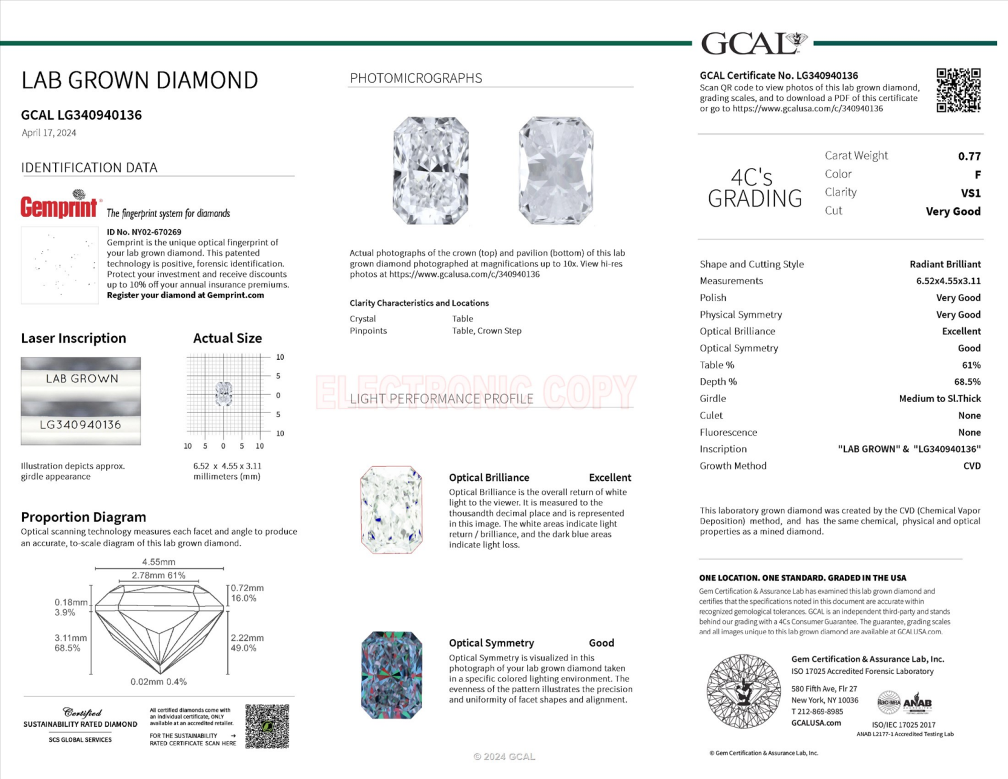 Your 0.77 carat Radiant lab diamond is graded F color (Colorless), and you can read more about F color diamonds here.