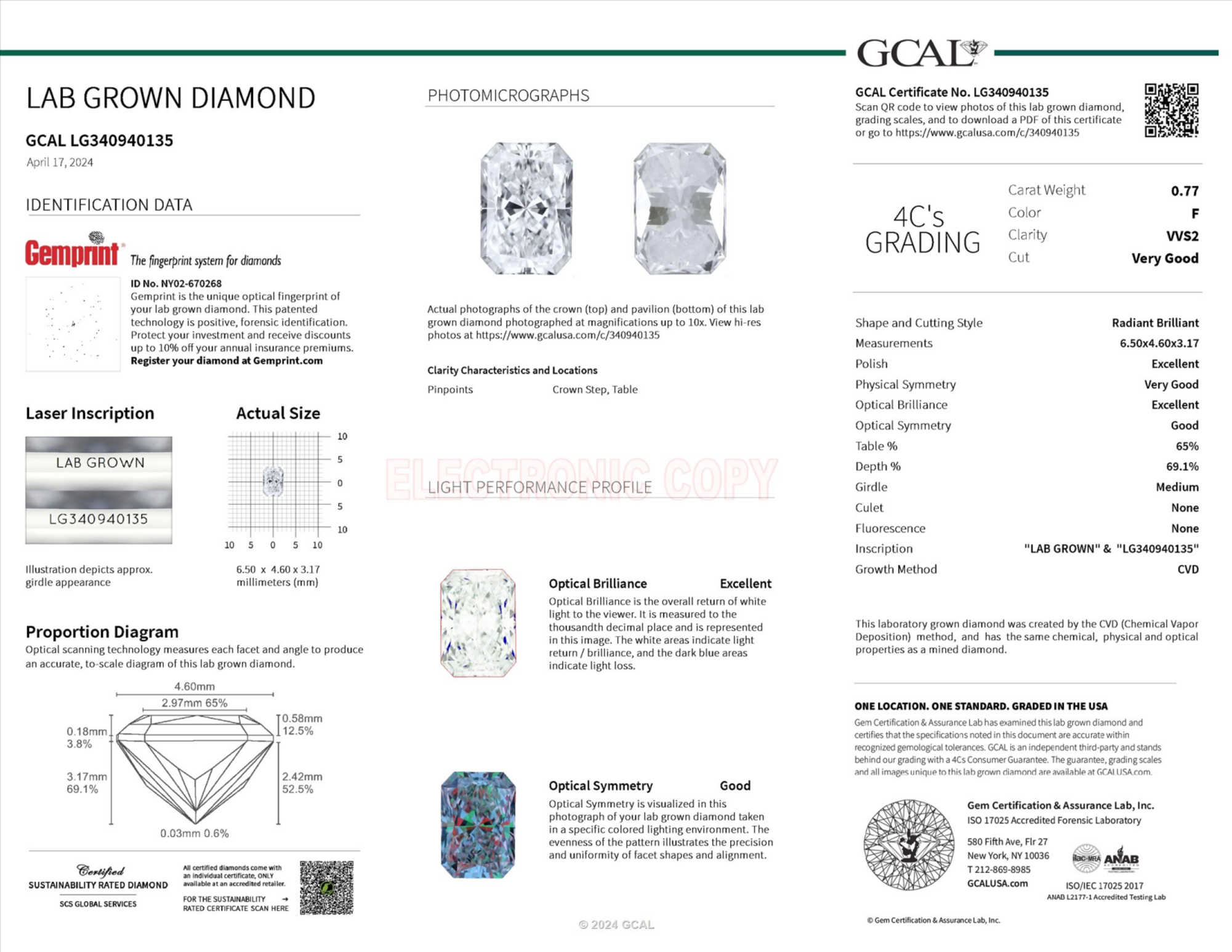 Your 0.77 carat Radiant lab diamond is graded F color (Colorless), and you can read more about F color diamonds here.