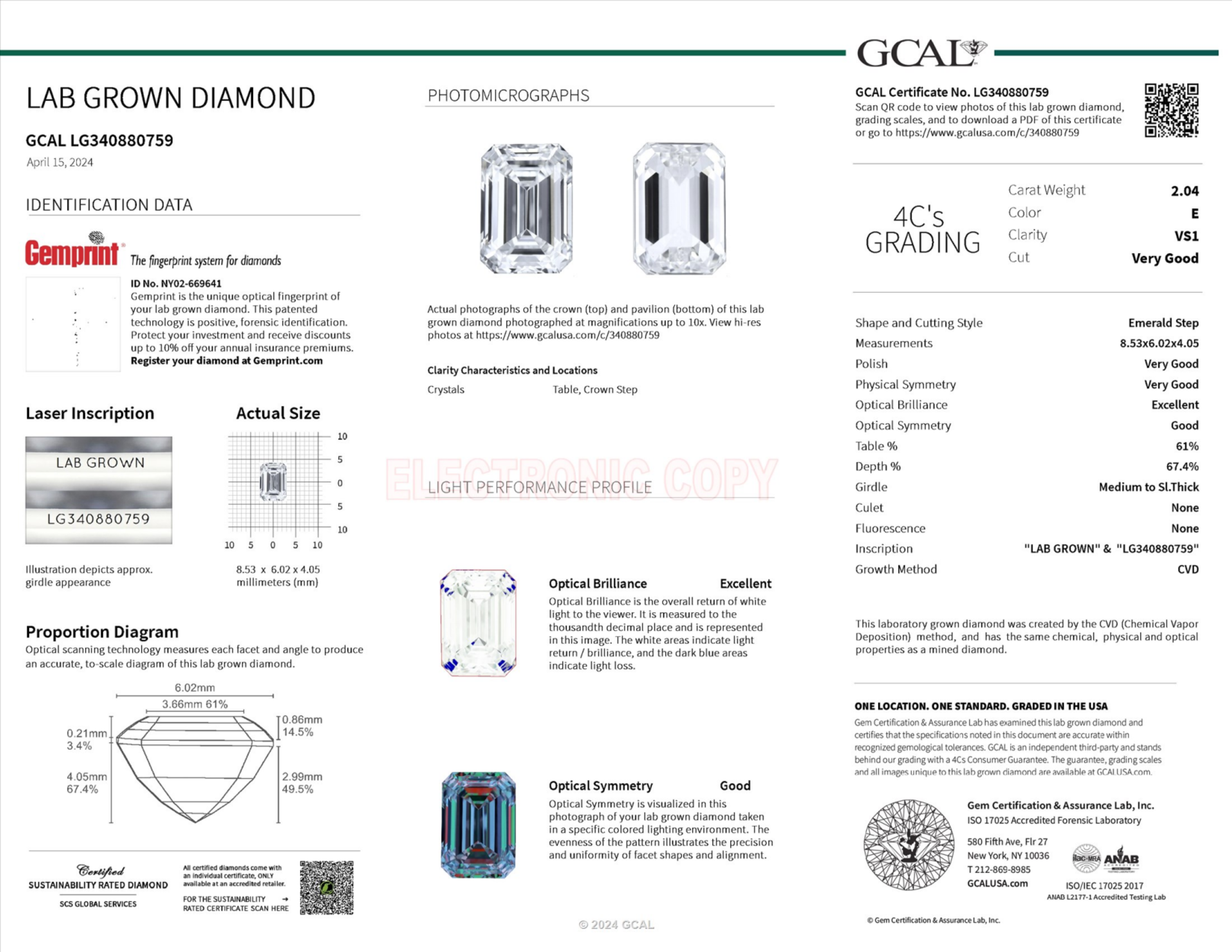 Your 2.04 carat Emerald lab diamond is graded E color (Colorless), and you can read more about E color diamonds here.