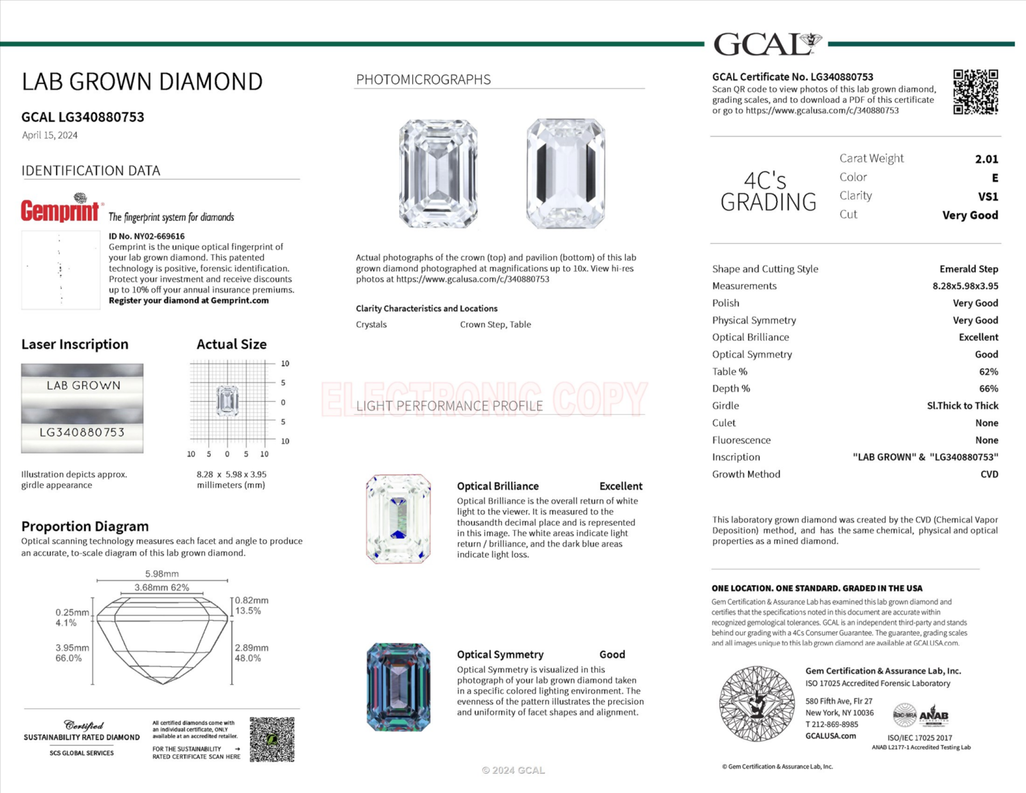Your 2.01 carat Emerald lab diamond is graded E color (Colorless), and you can read more about E color diamonds here.