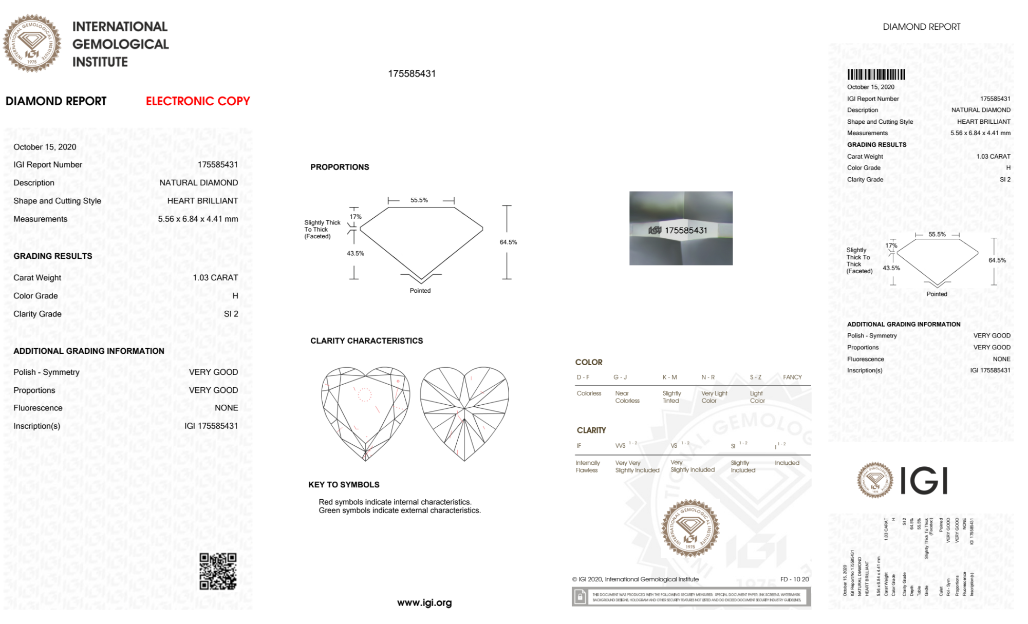 Your 1.03 carat Heart natural diamond is graded H color (Near Colorless), and you can read more about H color diamonds here.