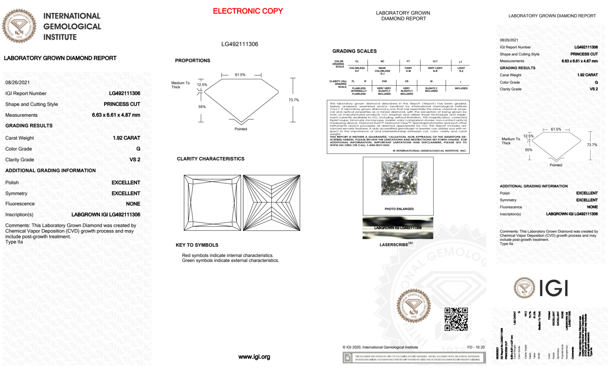 Your 1.92 carat Princess lab diamond is graded G color (Near Colorless), and you can read more about G color diamonds here.