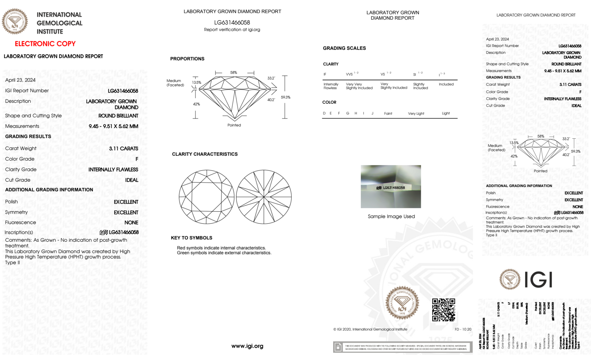 Your 3.11 carat Round lab diamond is graded IF clarity, which stands for Internally Flawless. Read more about IF clarity diamonds here, or learn more about diamond clarity in general here.