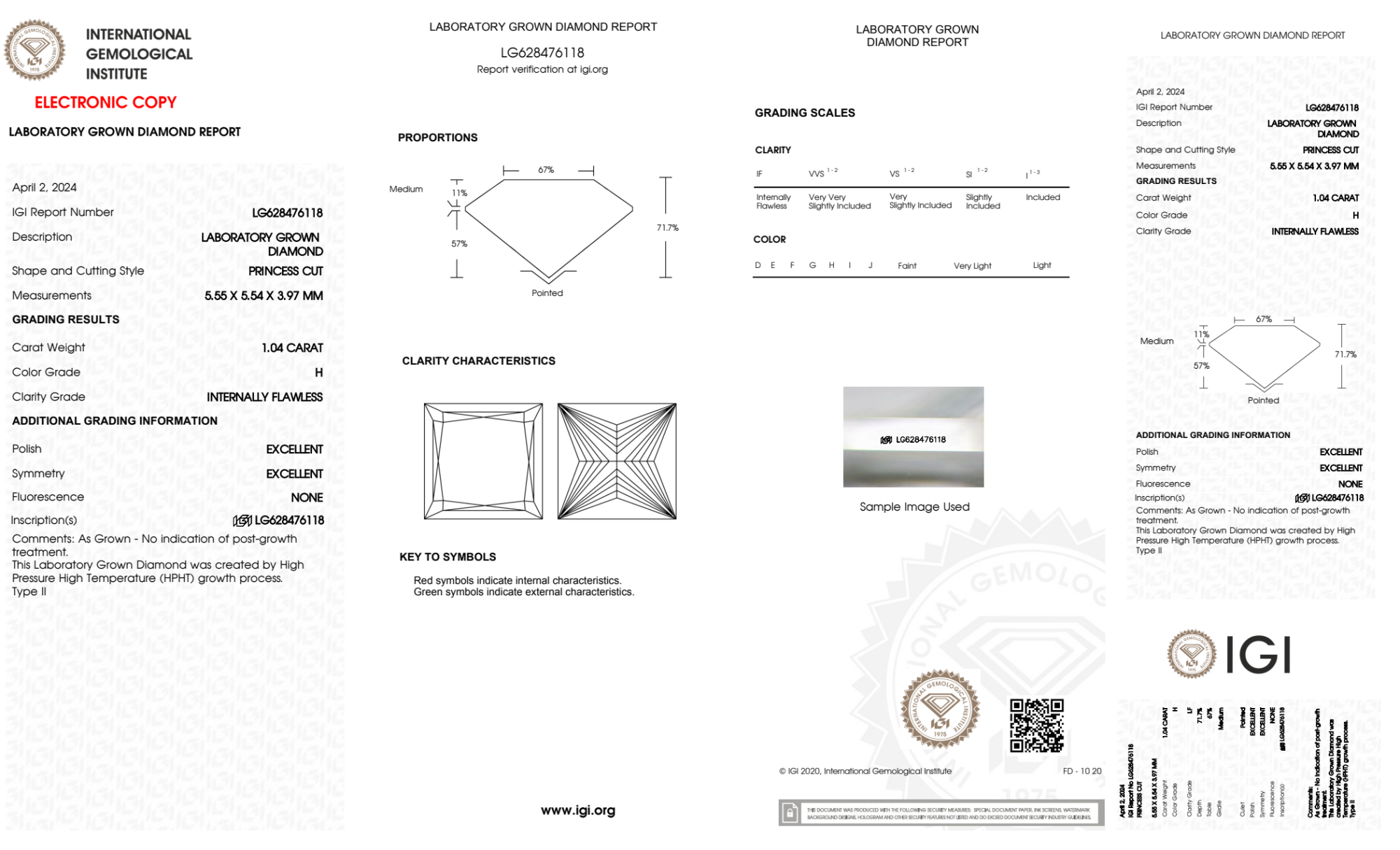 Your 1.04 carat Princess lab diamond is graded IF clarity, which stands for Internally Flawless. Read more about IF clarity diamonds here, or learn more about diamond clarity in general here.