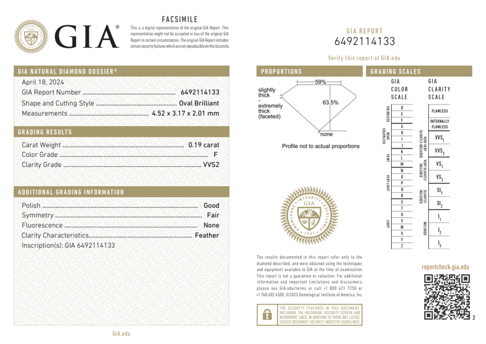 Your 0.19 carat Oval natural diamond is graded F color (Colorless), and you can read more about F color diamonds here.