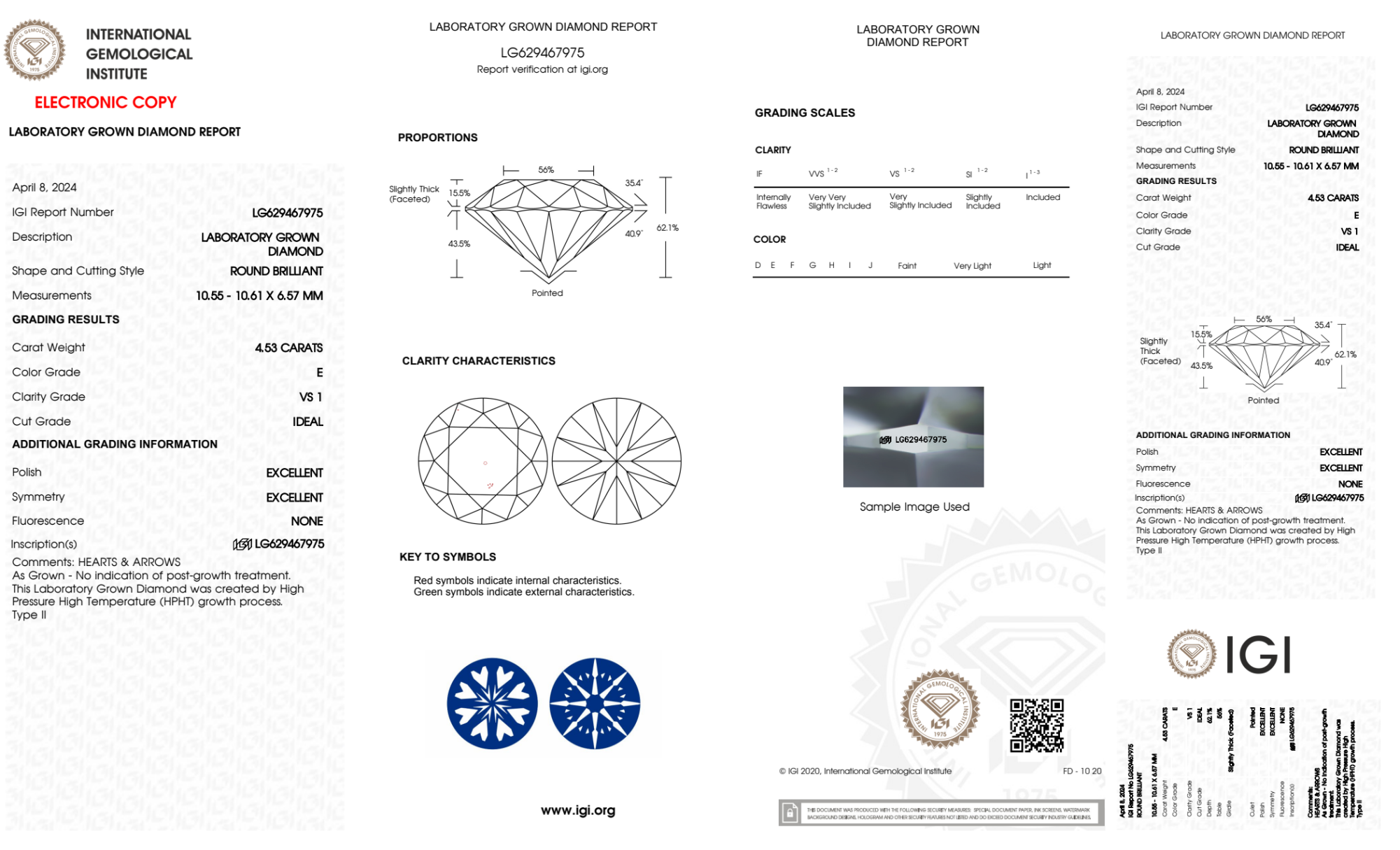 Your 4.53 carat Round lab diamond is graded E color (Colorless), and you can read more about E color diamonds here.