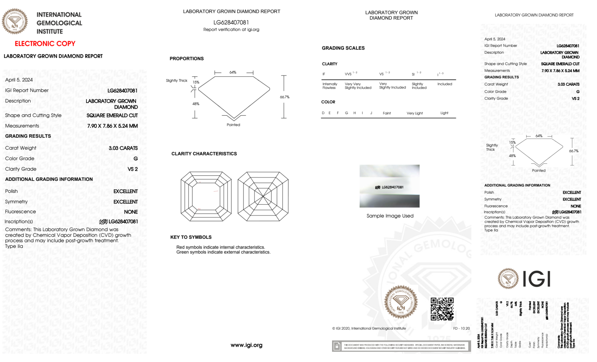 Your 3.03 carat Asscher lab diamond is graded G color (Near Colorless), and you can read more about G color diamonds here.