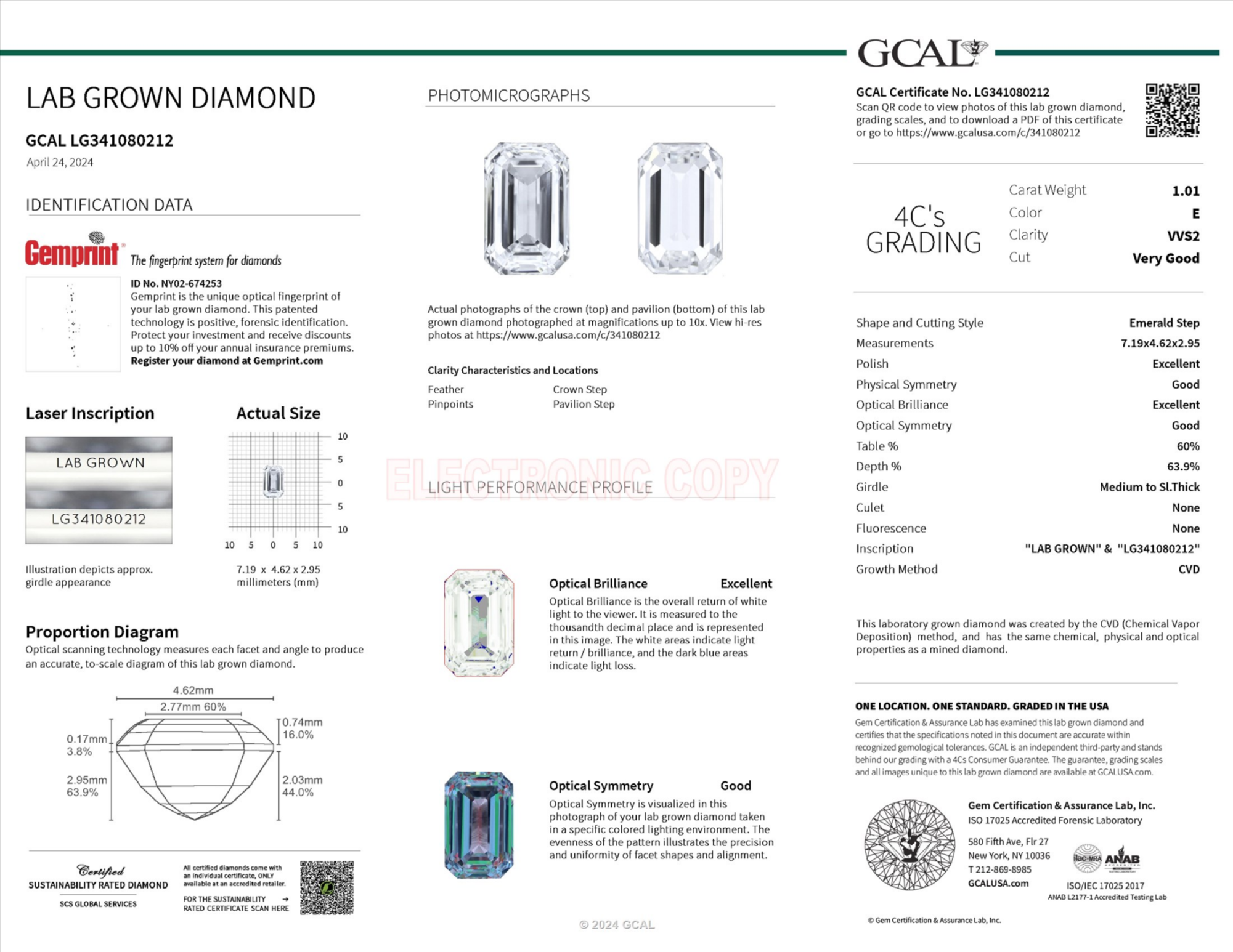 Your 1.01 carat Emerald lab diamond is graded E color (Colorless), and you can read more about E color diamonds here.