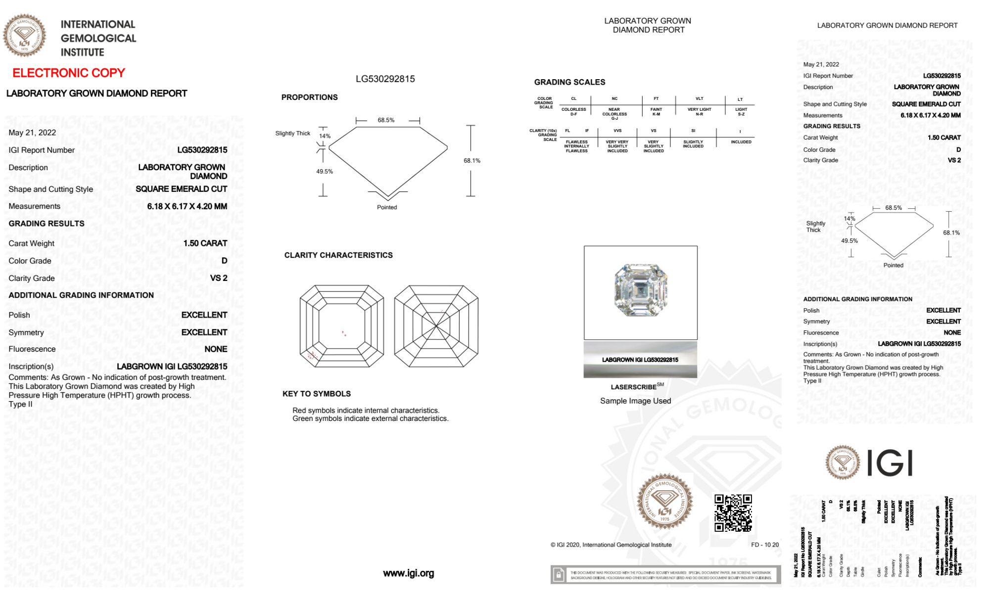 Your 1.50 carat Asscher lab diamond is graded D color (Colorless), and you can read more about D color diamonds here.