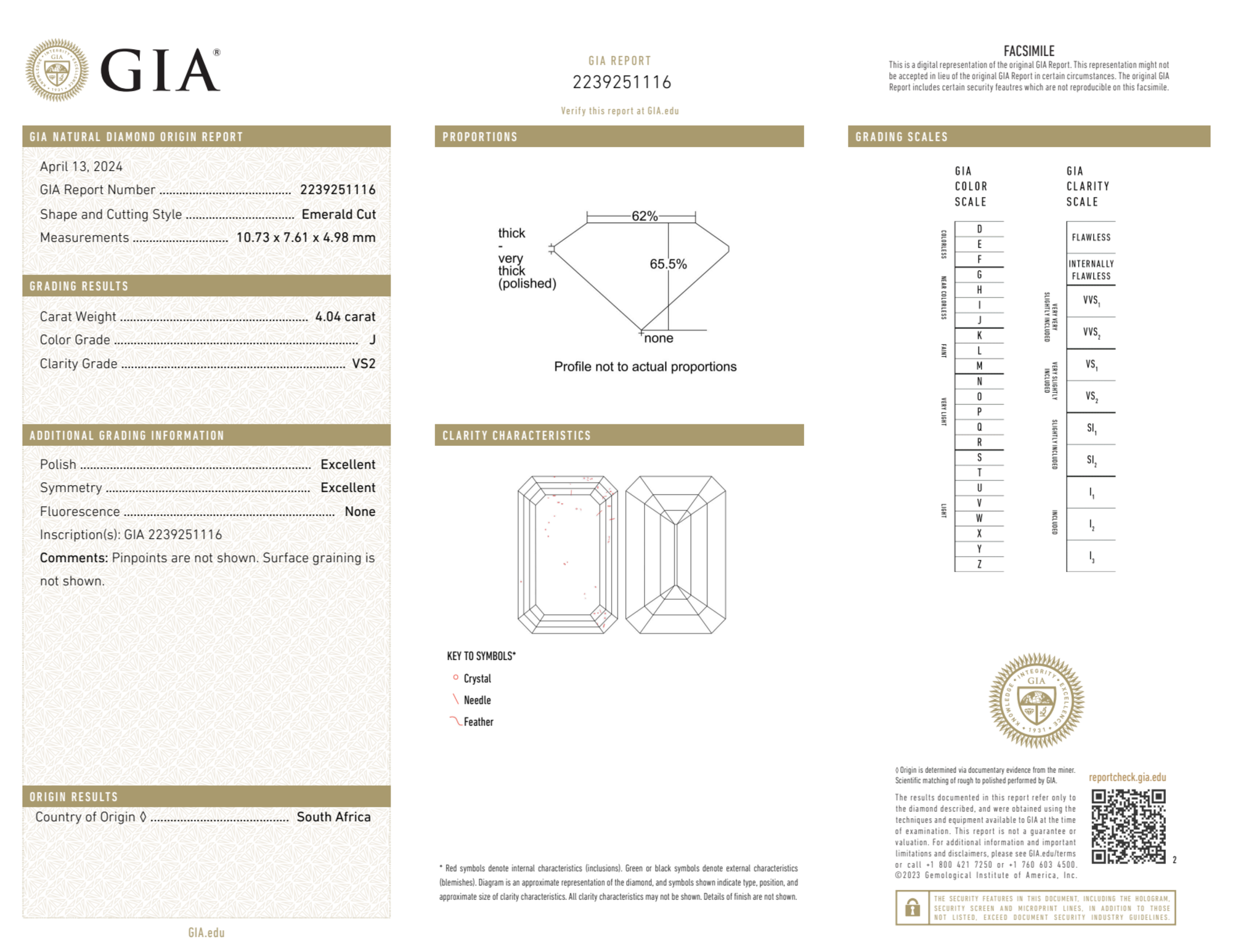Your 4.04 carat Emerald natural diamond is graded VS2 clarity, which stands for Very Slightly Included 2. Read more about VS2 clarity diamonds here, or learn more about diamond clarity in general here.