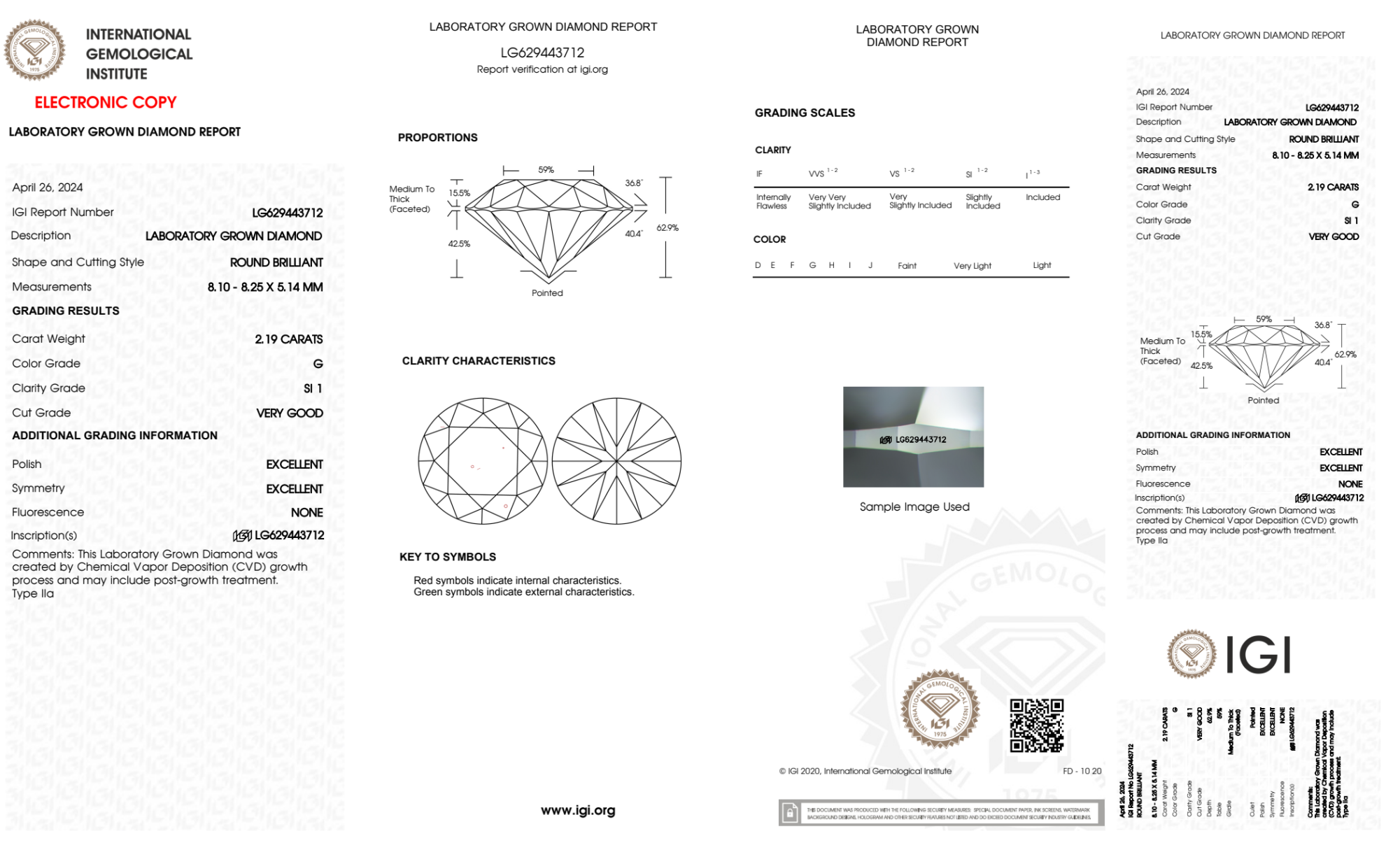 Your 2.19 carat Round lab diamond is graded SI1 clarity, which stands for Slightly Included 1. Read more about SI1 clarity diamonds here, or learn more about diamond clarity in general here.