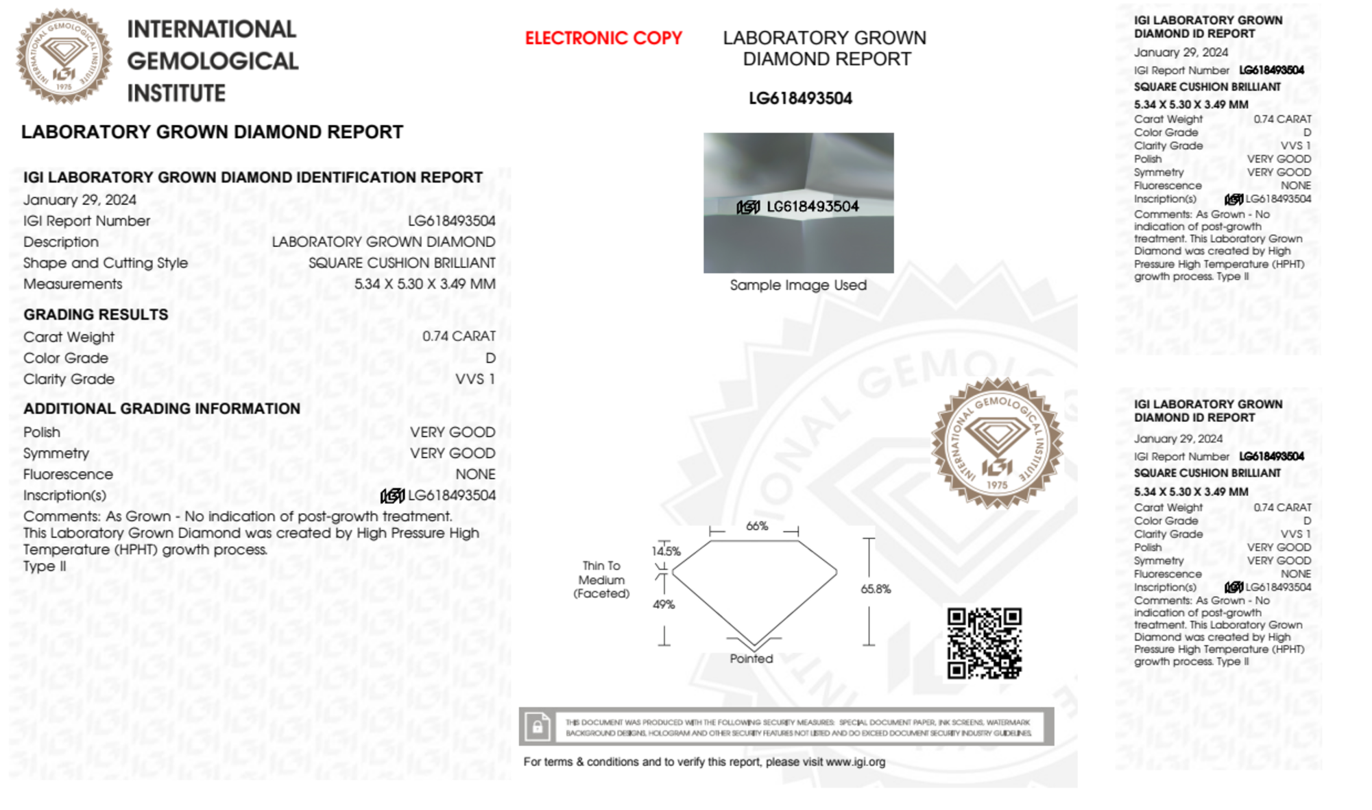 Your 0.74 carat Cushion lab diamond is graded D color (Colorless), and you can read more about D color diamonds here.