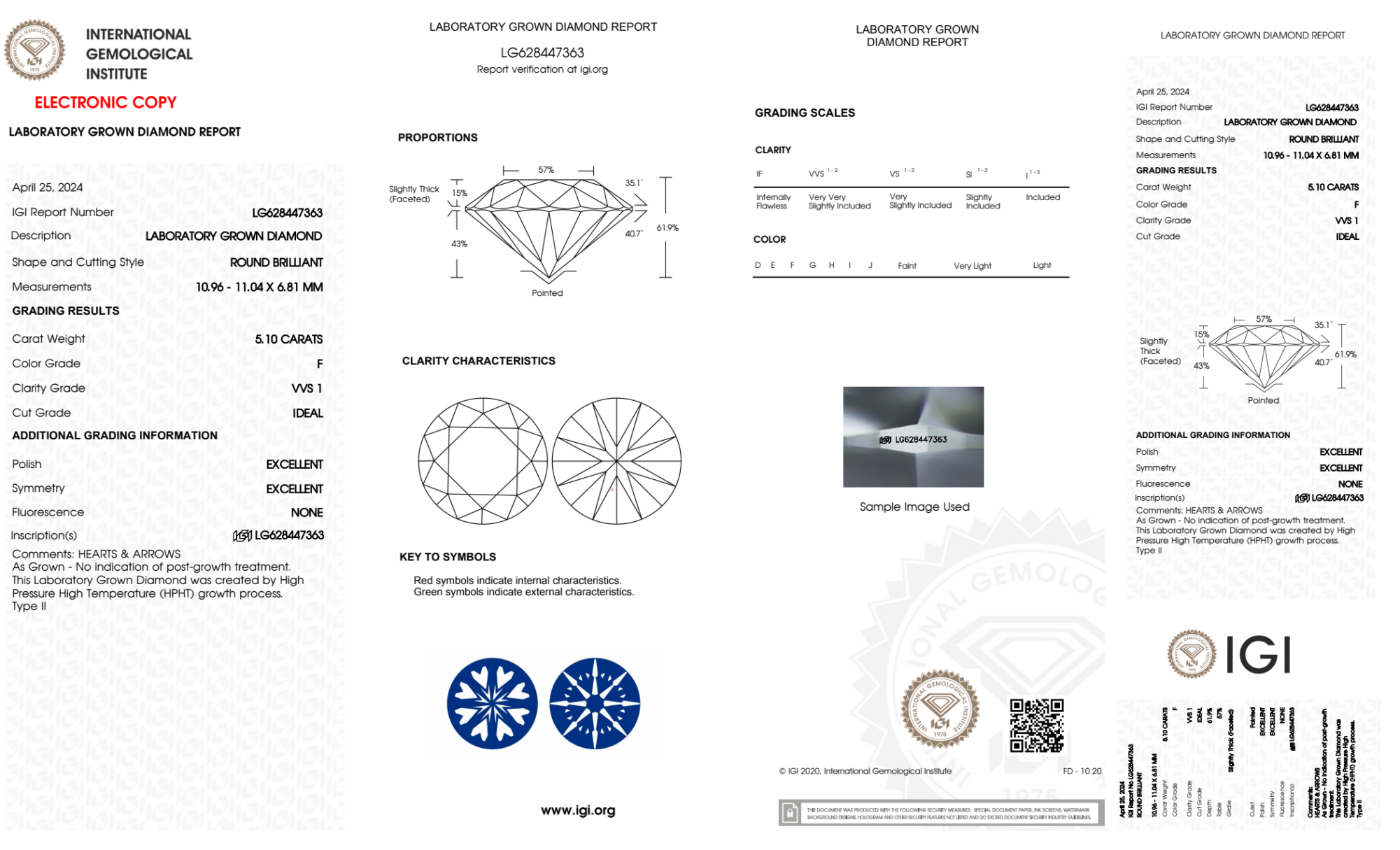 Your 5.10 carat Round lab diamond is graded VVS1 clarity, which stands for Very Very Slightly Included 1. Read more about VVS1 clarity diamonds here, or learn more about diamond clarity in general here.