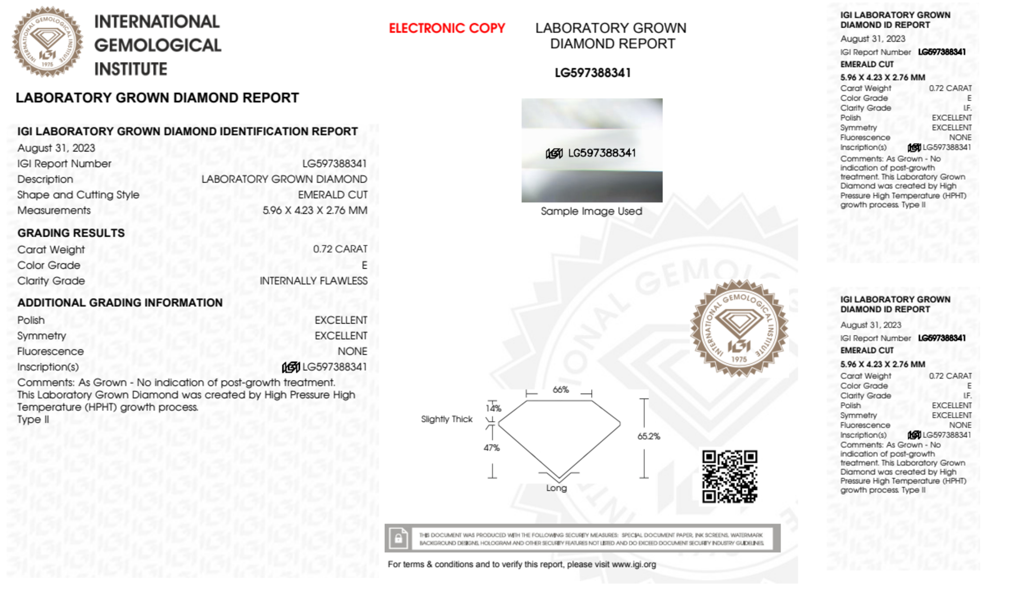 Your 0.72 carat Emerald lab diamond is graded IF clarity, which stands for Internally Flawless. Read more about IF clarity diamonds here, or learn more about diamond clarity in general here.