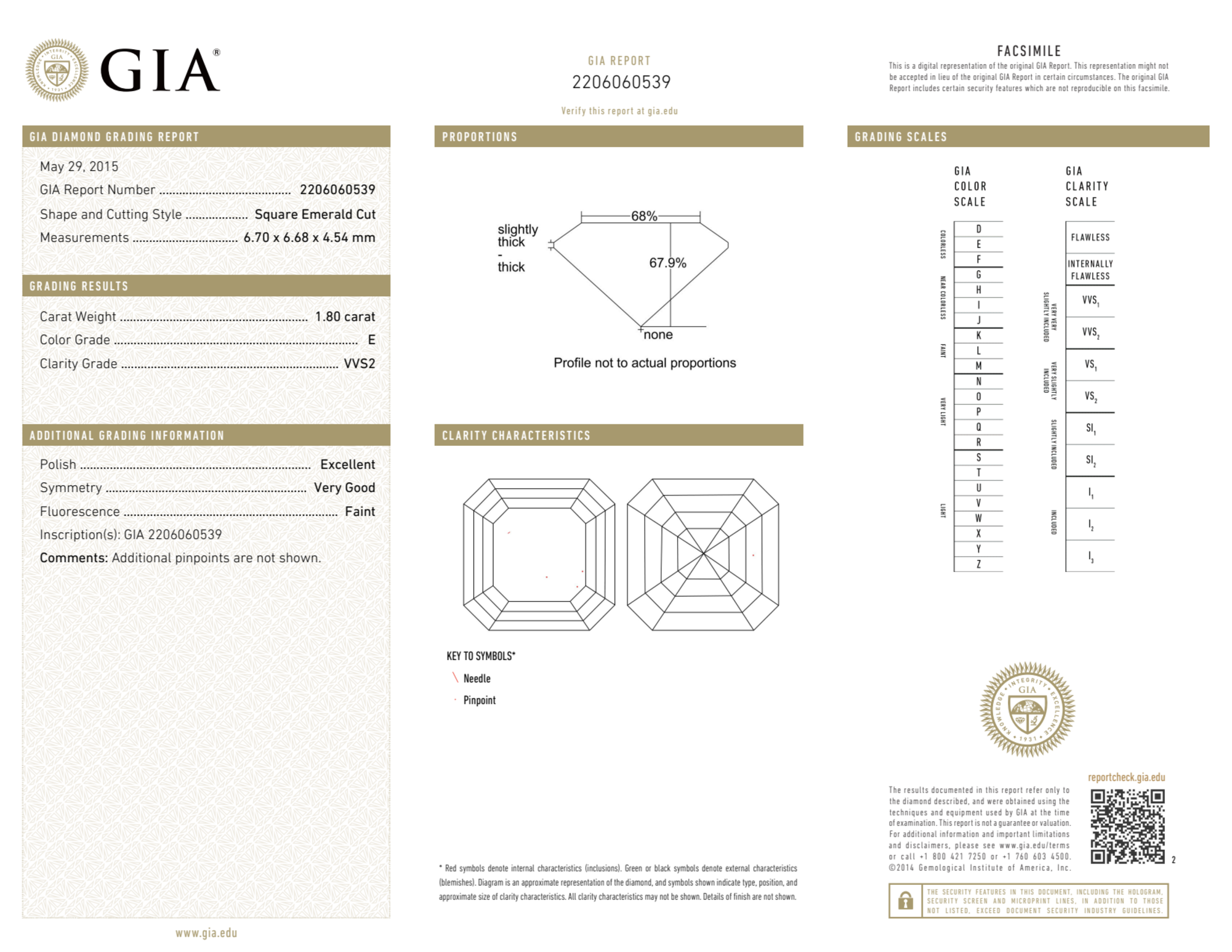 Your 1.80 carat Asscher natural diamond is graded E color (Colorless), and you can read more about E color diamonds here.