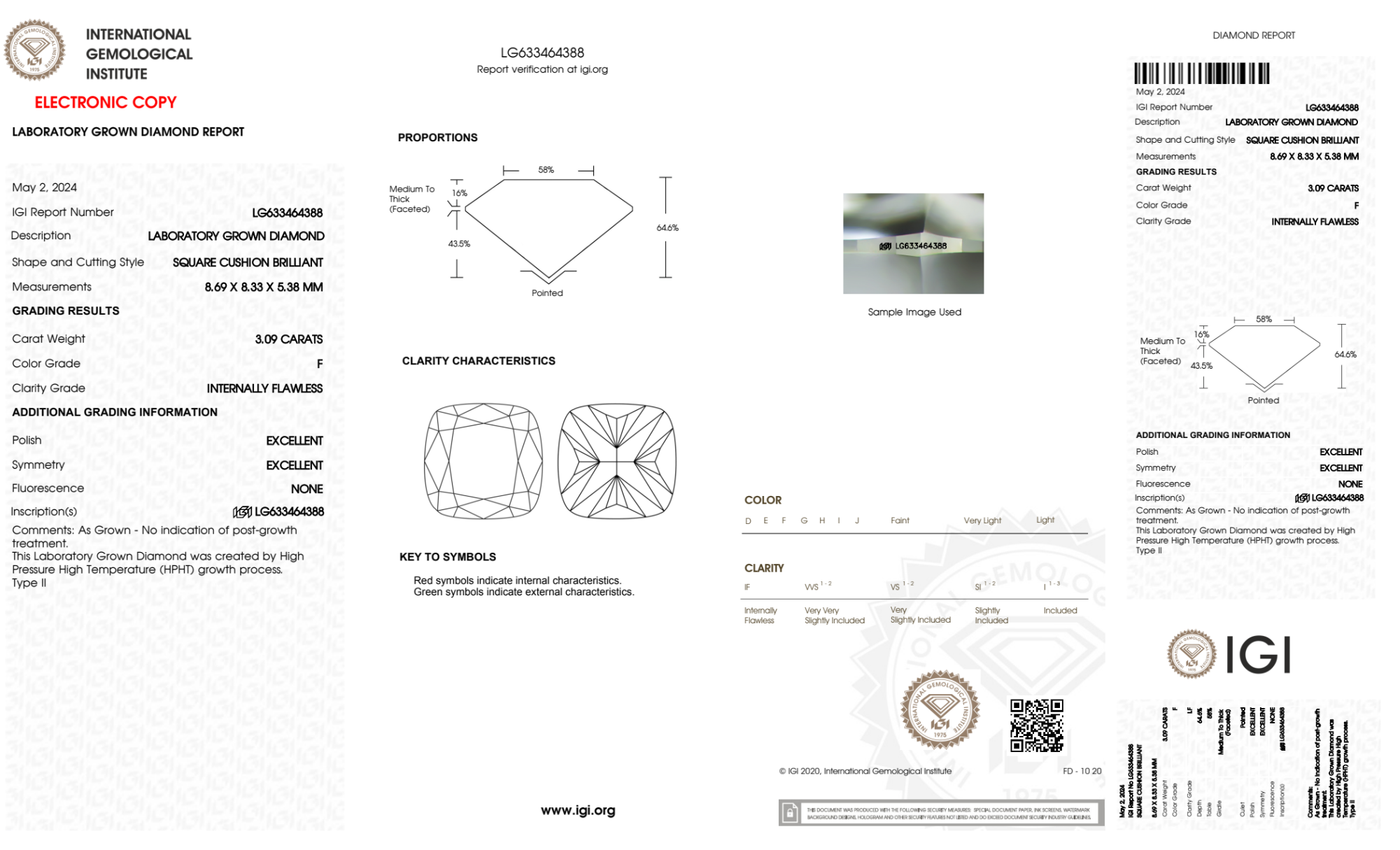 Your 3.09 carat Cushion lab diamond is graded IF clarity, which stands for Internally Flawless. Read more about IF clarity diamonds here, or learn more about diamond clarity in general here.