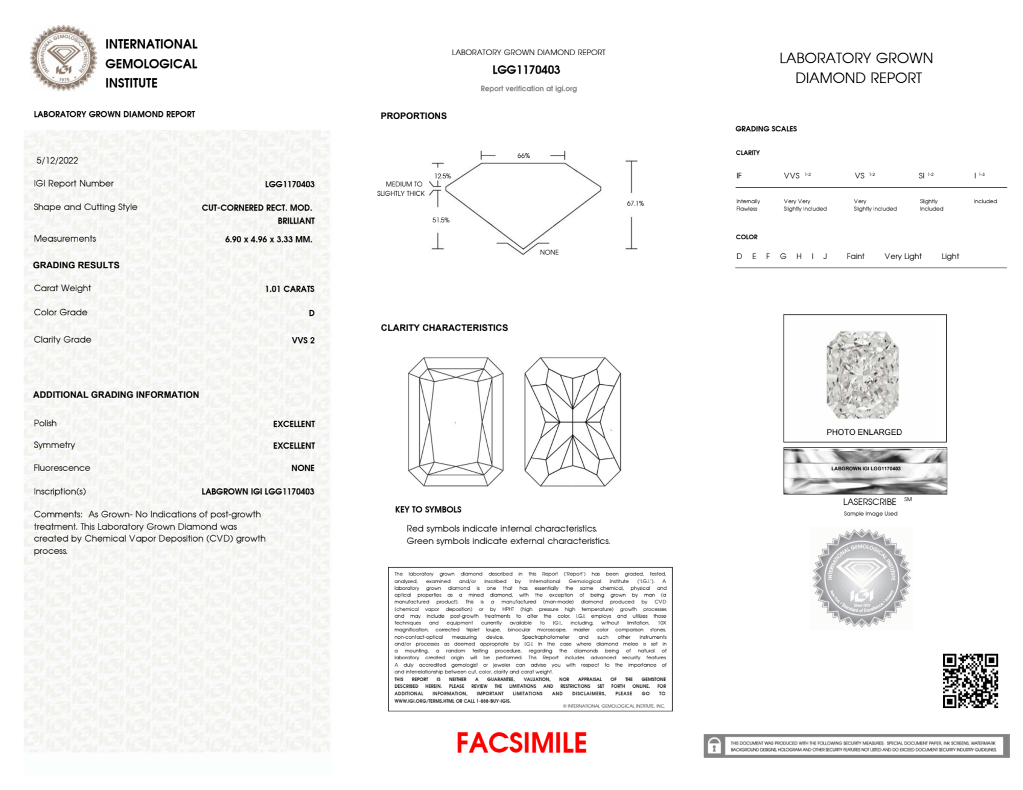 Your 1.01 carat Radiant lab diamond is graded D color (Colorless), and you can read more about D color diamonds here.
