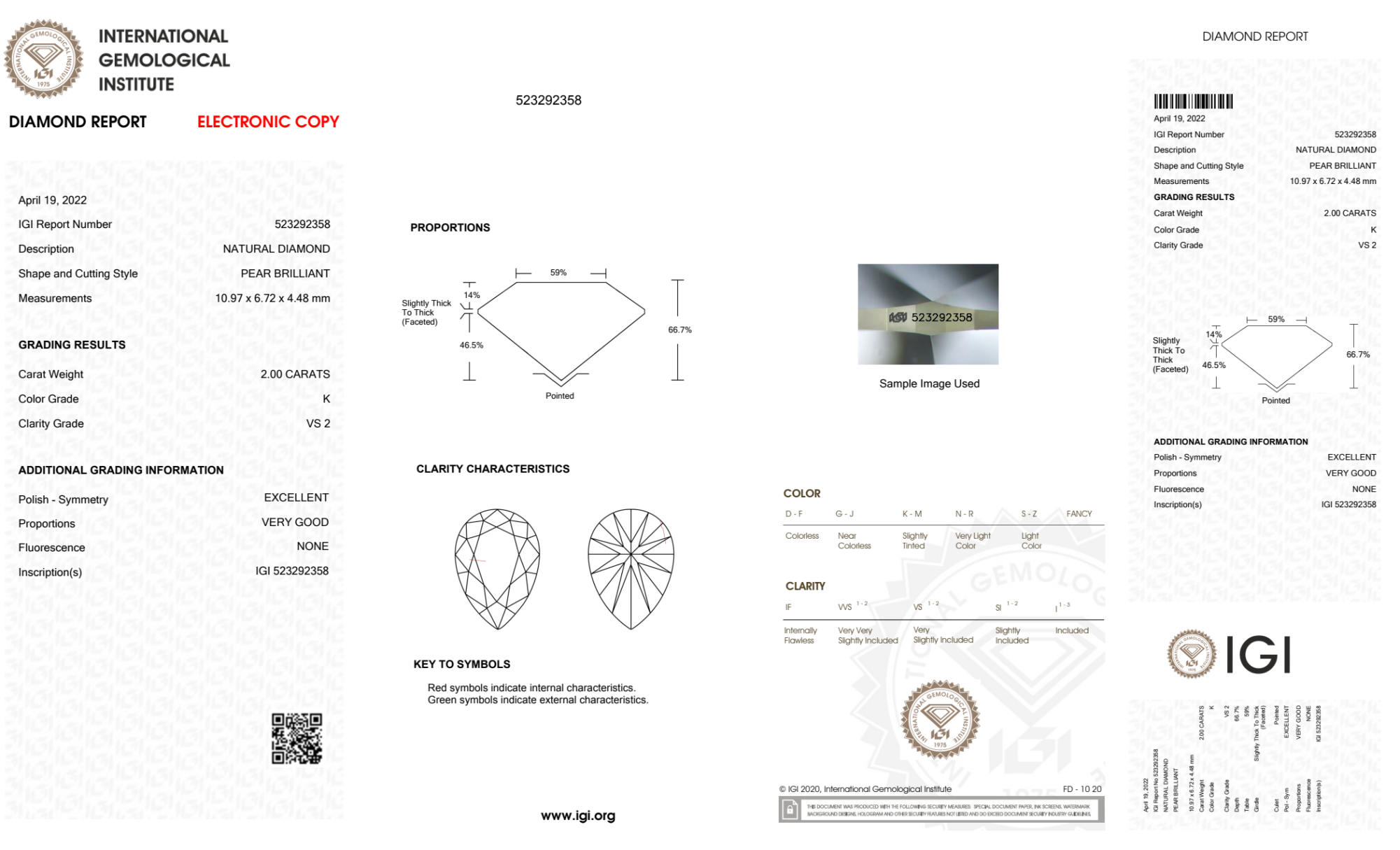Your 2.00 carat Pear natural diamond is graded K color (Faint Color), and you can read more about K color diamonds here.
