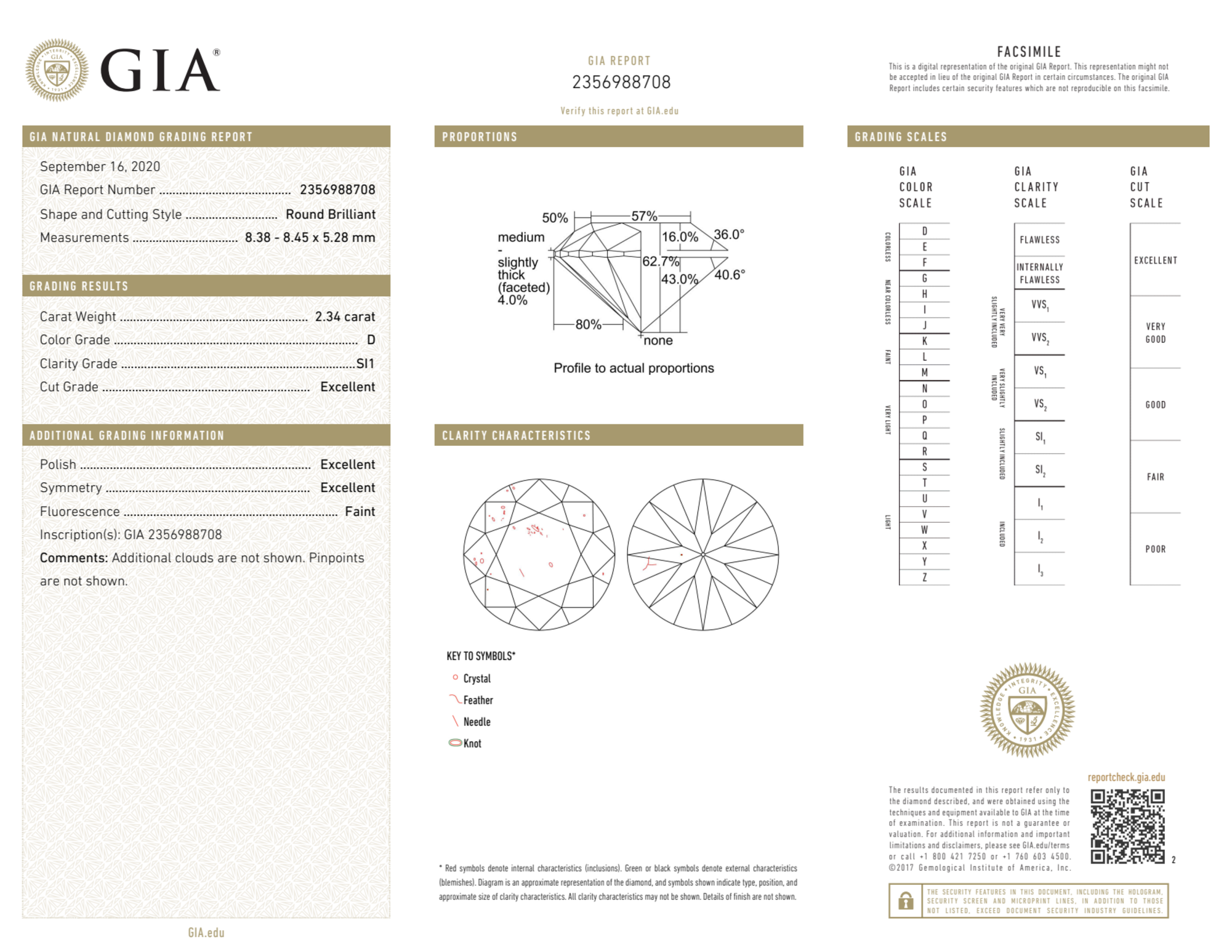 Your 2.34 carat Round natural diamond is graded D color (Colorless), and you can read more about D color diamonds here.
