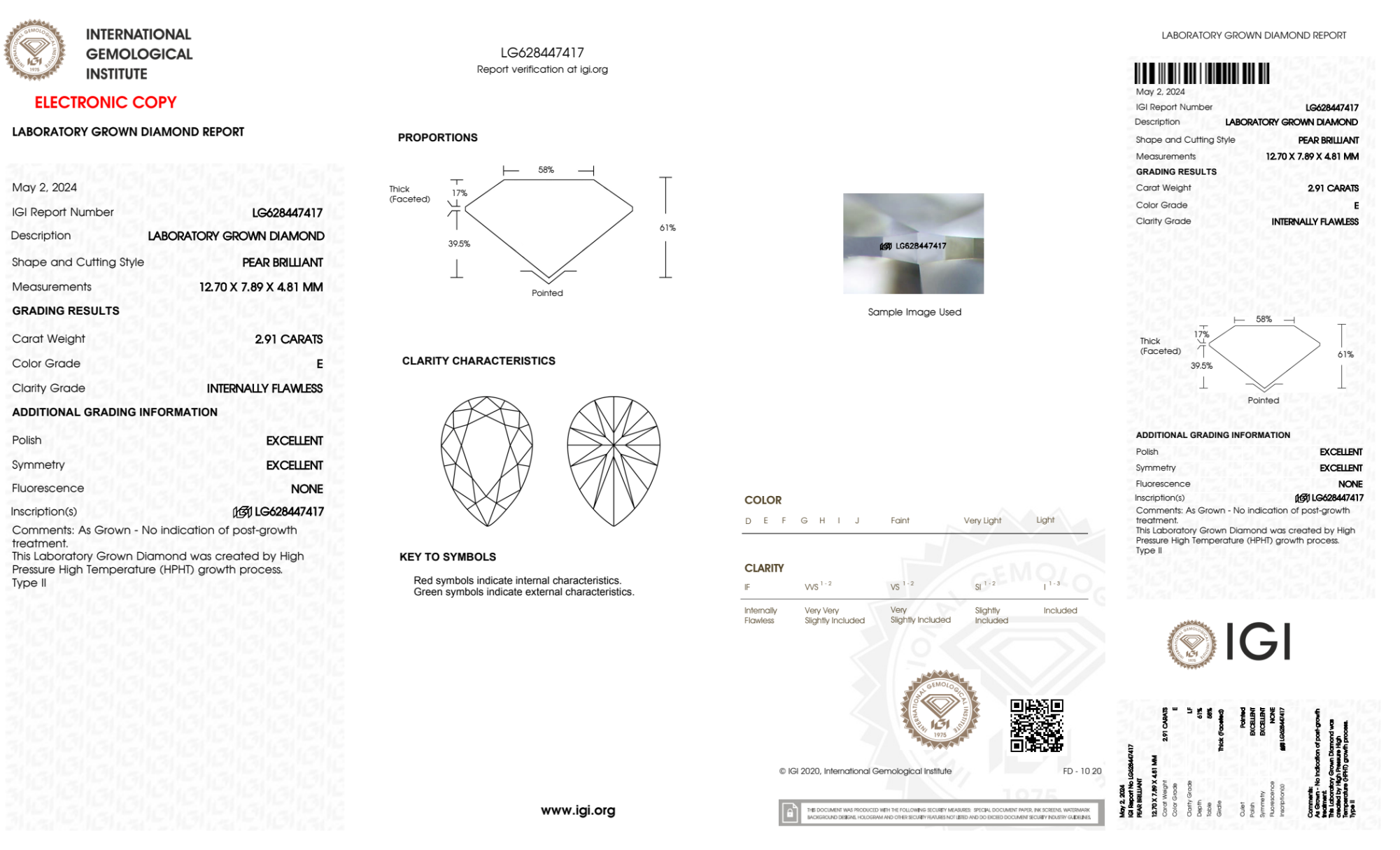 Your 2.91 carat Pear lab diamond is graded IF clarity, which stands for Internally Flawless. Read more about IF clarity diamonds here, or learn more about diamond clarity in general here.