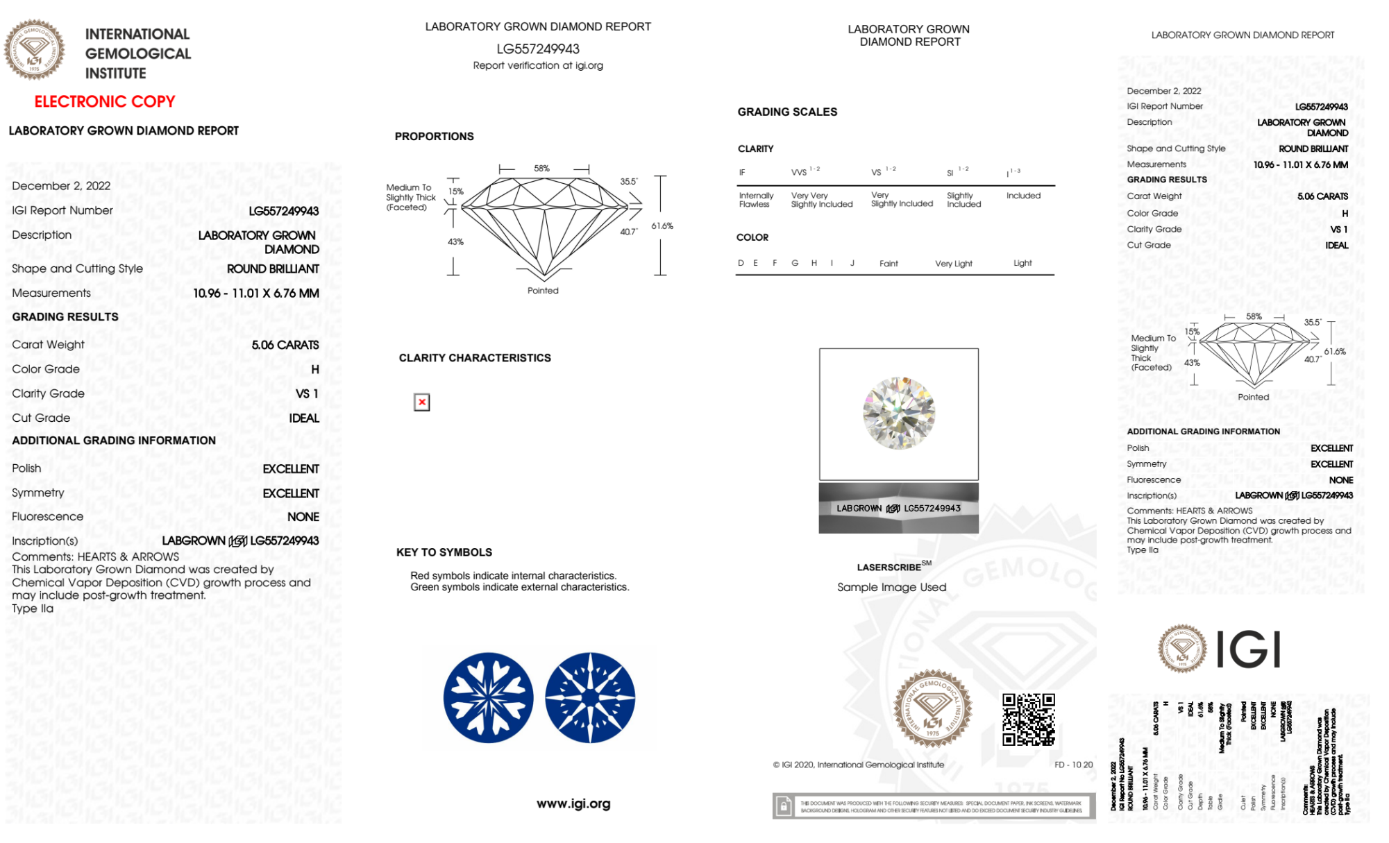 Your 5.06 carat Round lab diamond is graded H color (Near Colorless), and you can read more about H color diamonds here.