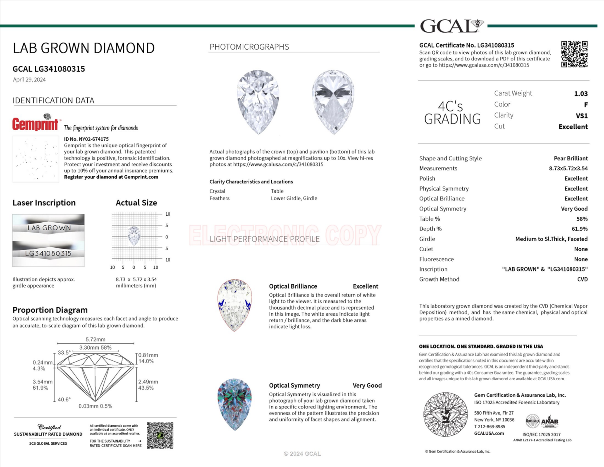 Your 1.03 carat Pear lab diamond is graded F color (Colorless), and you can read more about F color diamonds here.