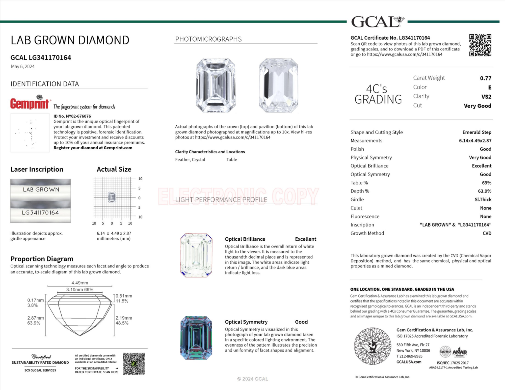 Your 0.77 carat Emerald lab diamond is graded E color (Colorless), and you can read more about E color diamonds here.