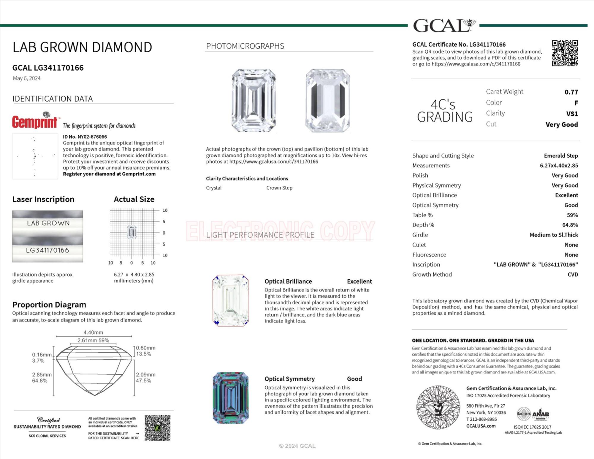 Your 0.77 carat Emerald lab diamond is graded F color (Colorless), and you can read more about F color diamonds here.