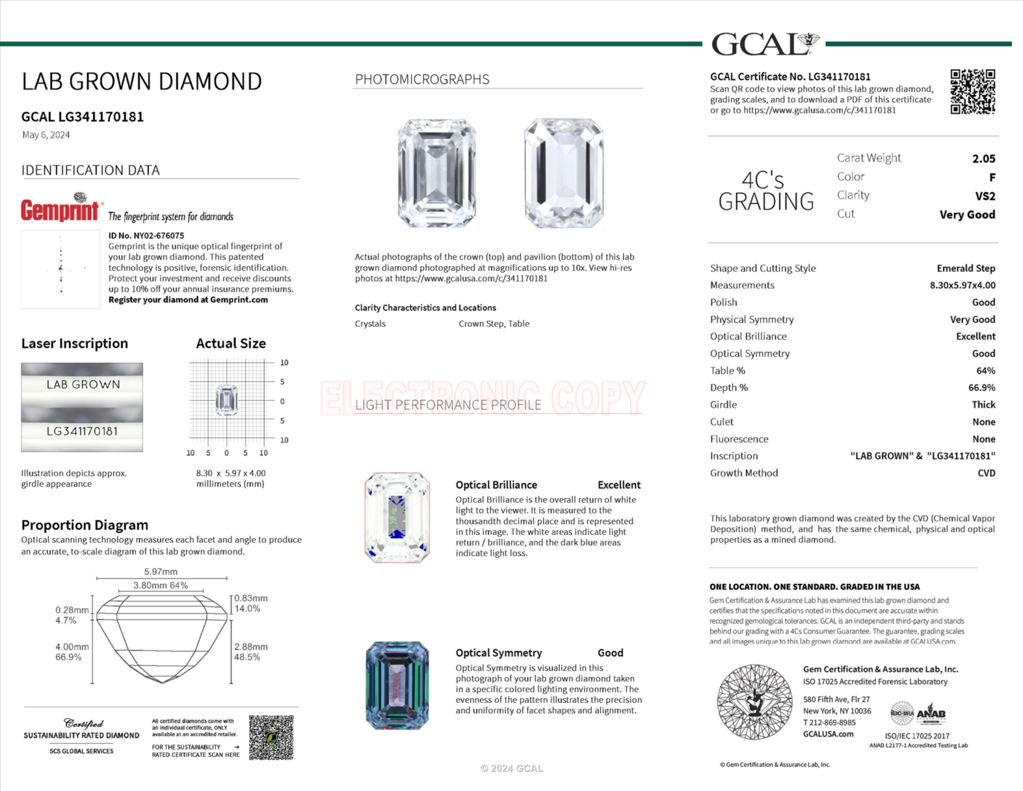 Your 2.05 carat Emerald lab diamond is graded F color (Colorless), and you can read more about F color diamonds here.