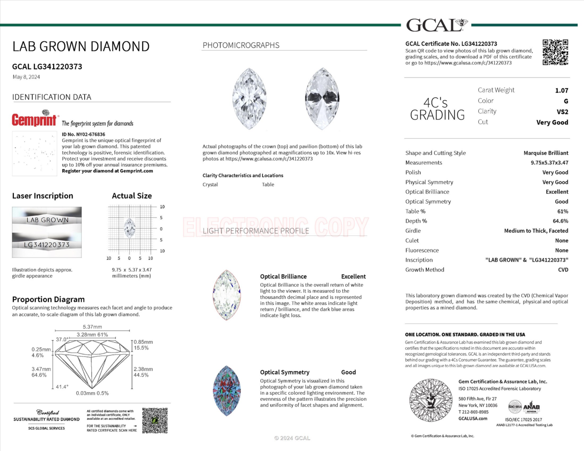 Your 1.07 carat Marquise lab diamond is graded G color (Near Colorless), and you can read more about G color diamonds here.