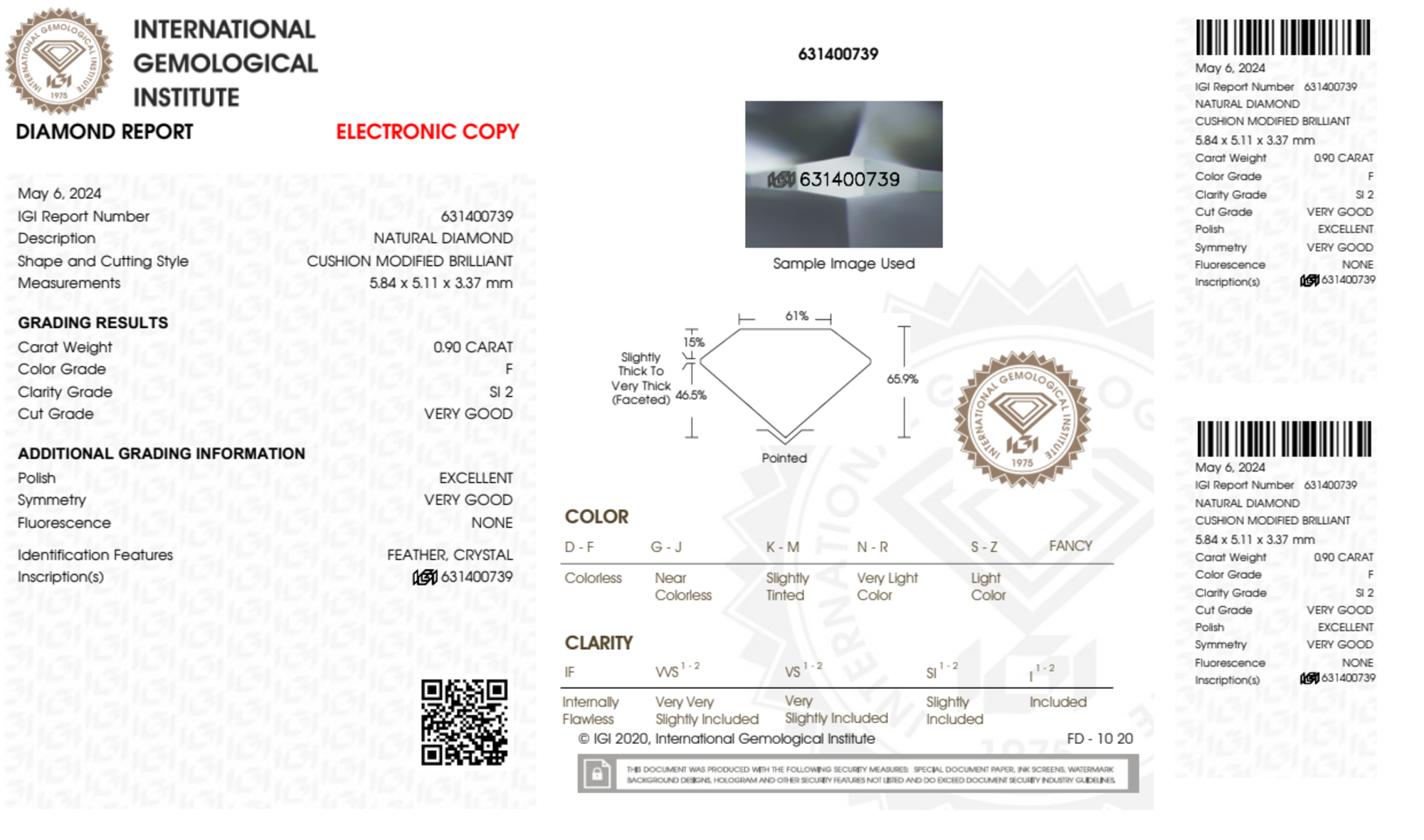 Your 0.90 carat Cushion natural diamond is graded F color (Colorless), and you can read more about F color diamonds here.