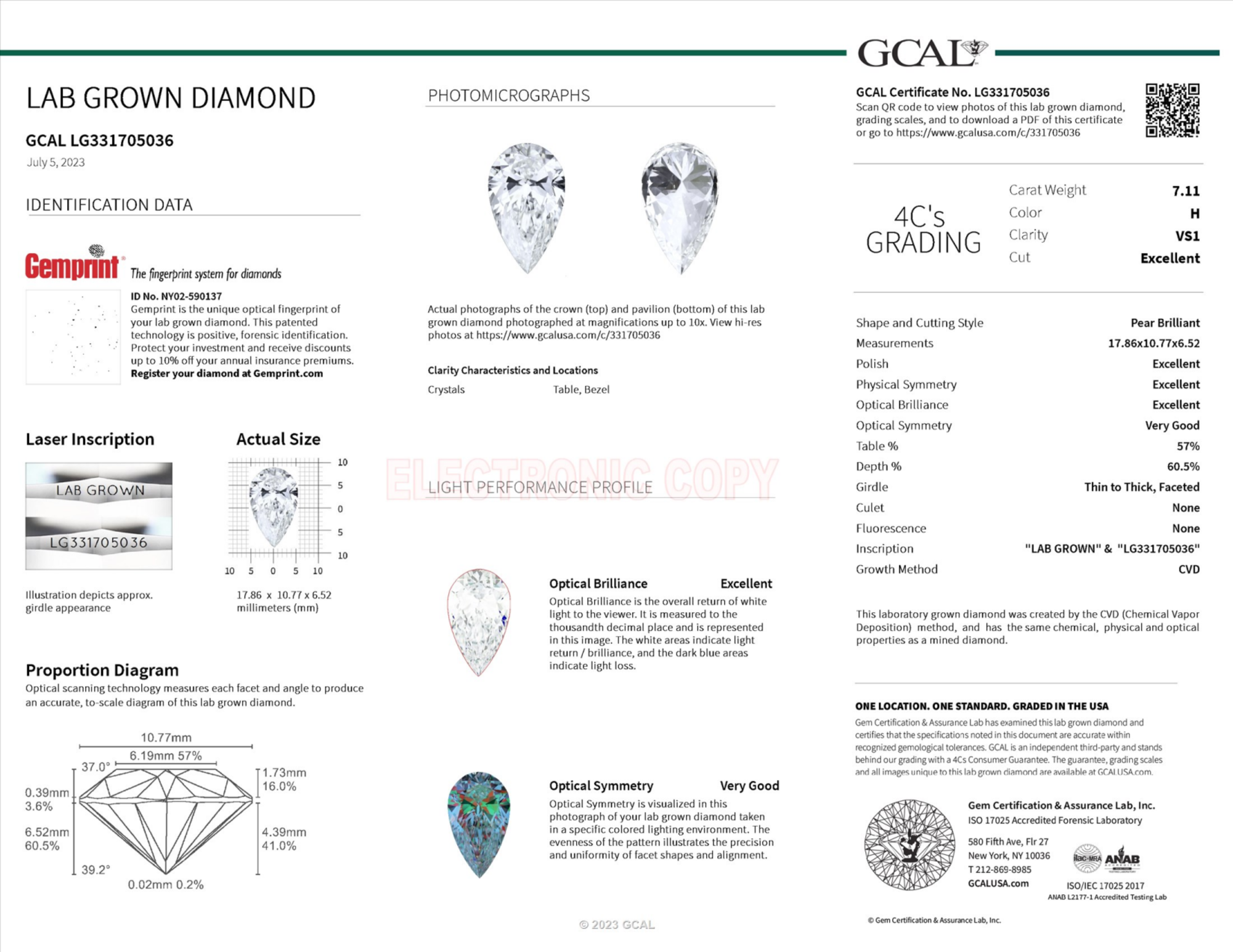 Your 7.11 carat Pear lab diamond is graded VS1 clarity, which stands for Very Slightly Included 1. Read more about VS1 clarity diamonds here, or learn more about diamond clarity in general here.