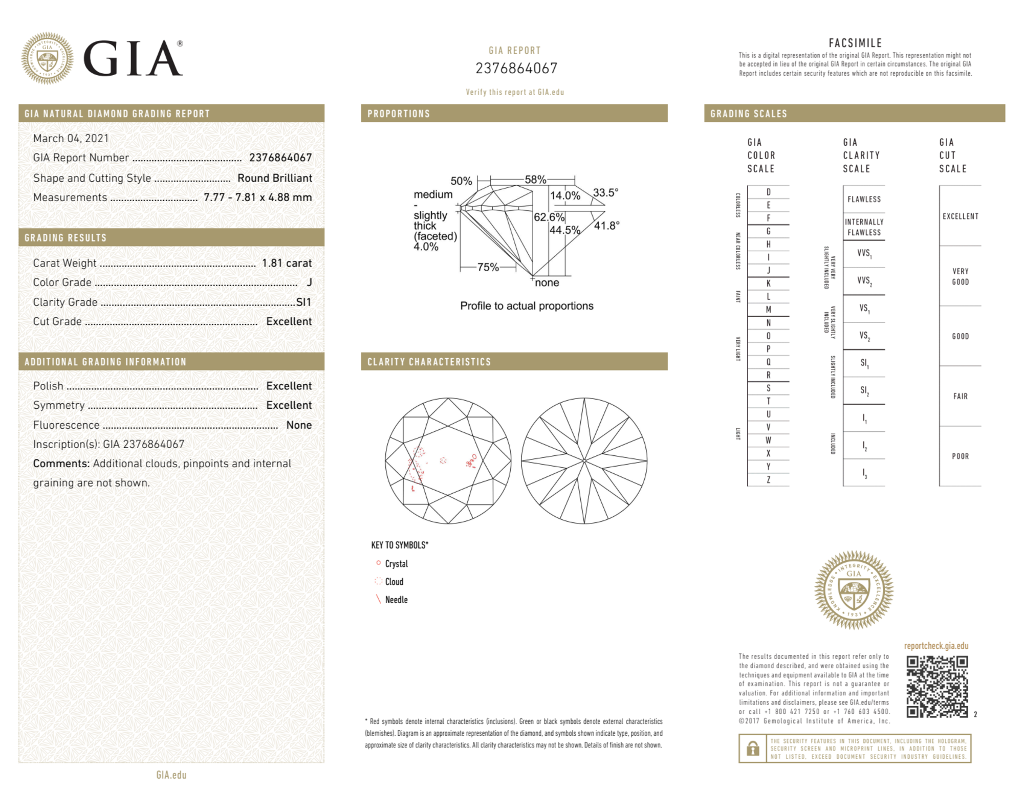Your 1.81 carat Round natural diamond is graded SI1 clarity, which stands for Slightly Included 1. Read more about SI1 clarity diamonds here, or learn more about diamond clarity in general here.