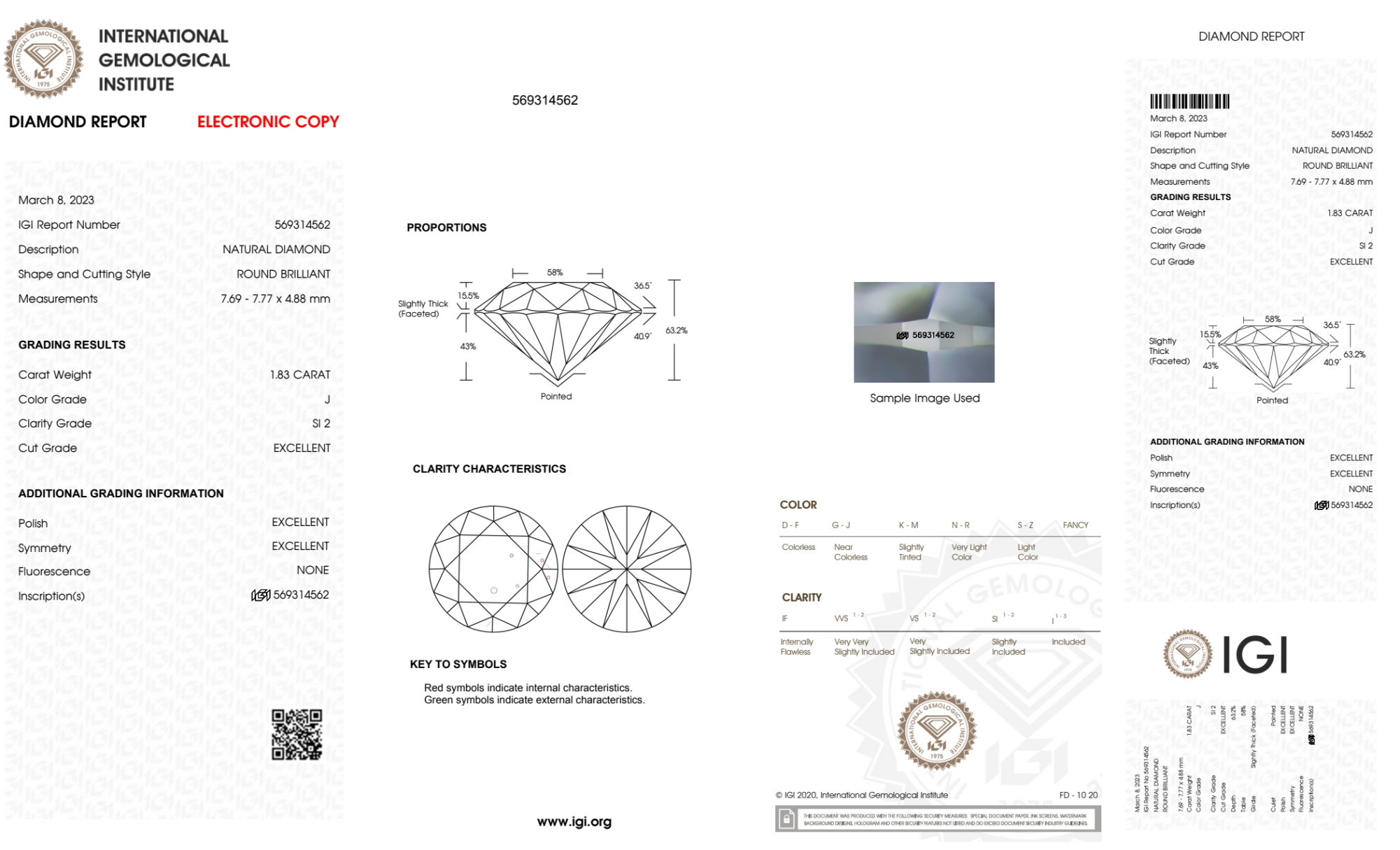Your 1.83 carat Round natural diamond is graded J color (Near Colorless), and you can read more about J color diamonds here.