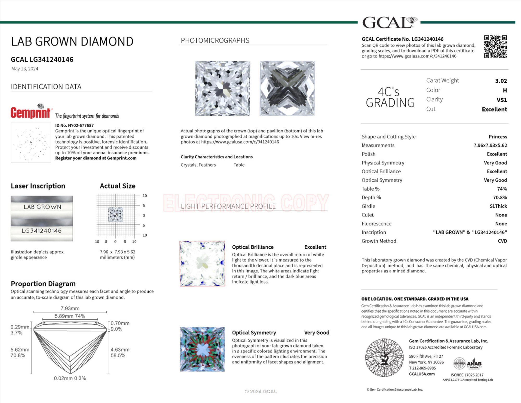 Your 3.02 carat Princess lab diamond is graded VS1 clarity, which stands for Very Slightly Included 1. Read more about VS1 clarity diamonds here, or learn more about diamond clarity in general here.