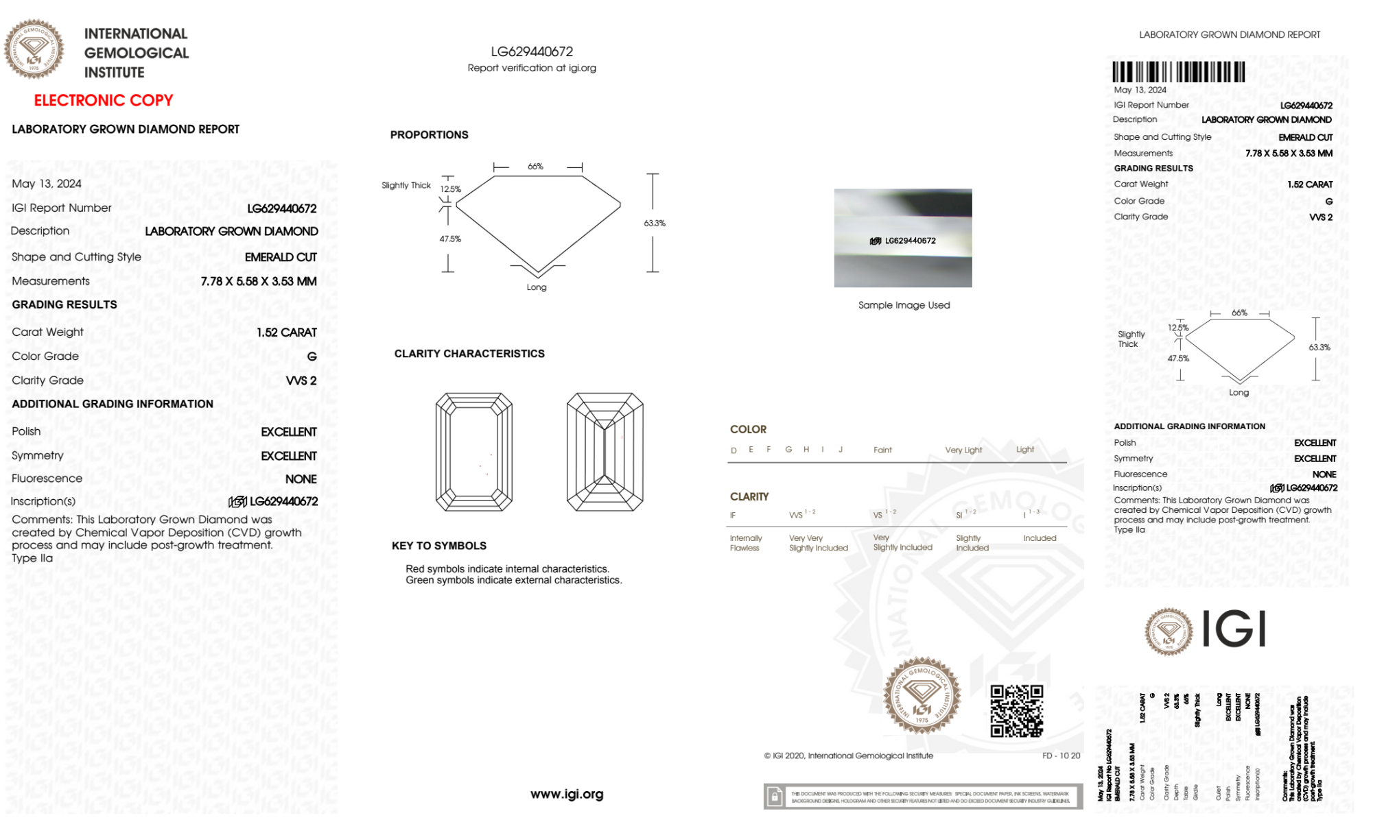 Your 1.52 carat Emerald lab diamond is graded G color (Near Colorless), and you can read more about G color diamonds here.