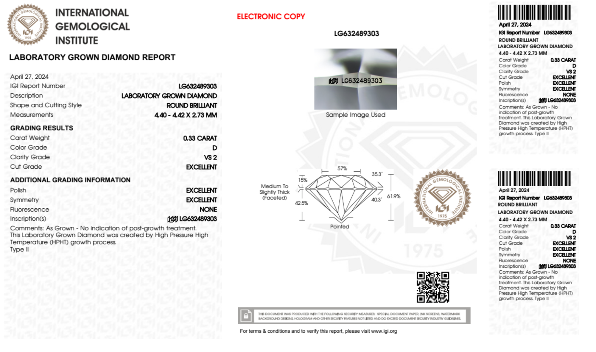 Your 0.33 carat Round lab diamond is graded D color (Colorless), and you can read more about D color diamonds here.