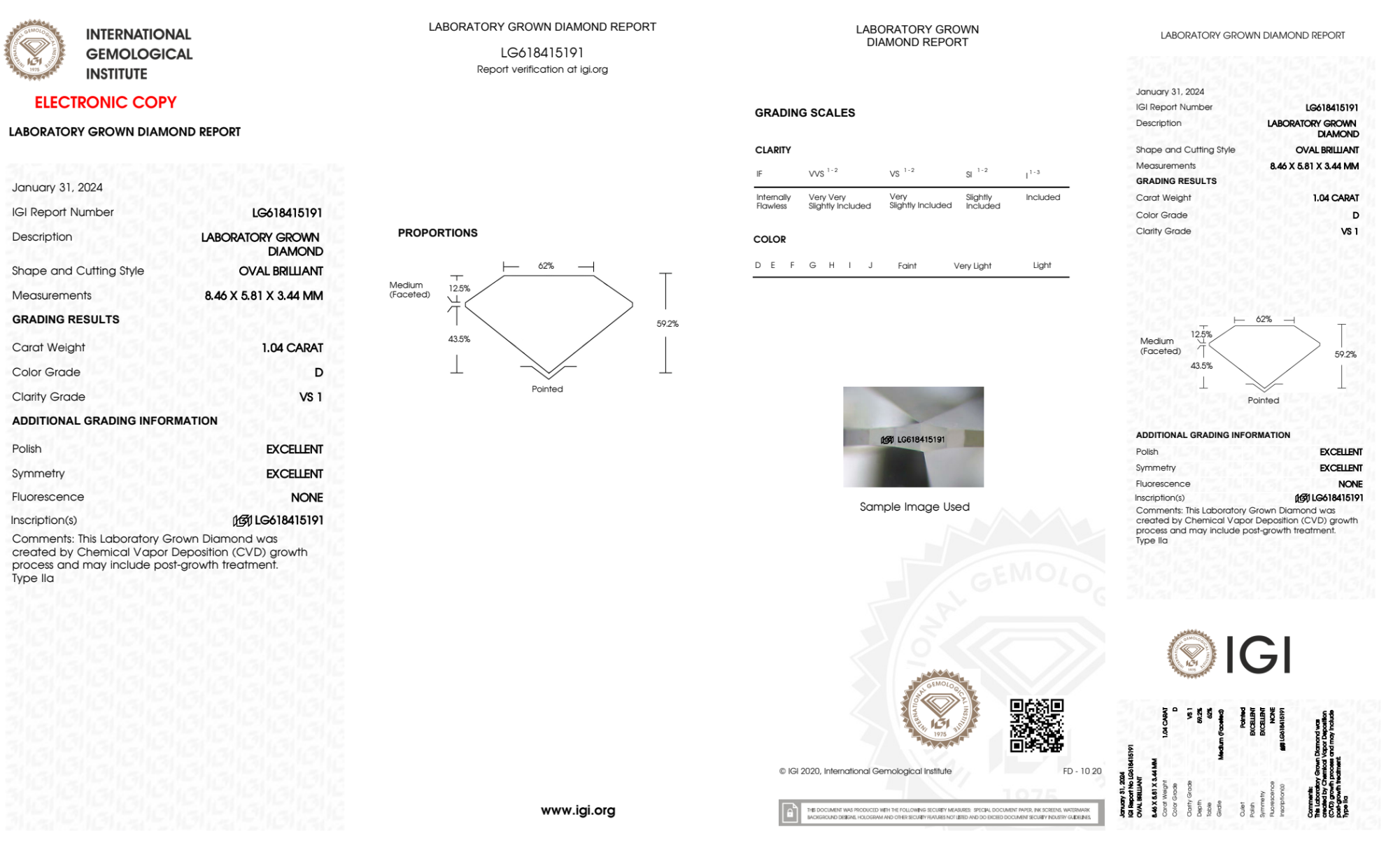 Your 1.04 carat Oval lab diamond is graded D color (Colorless), and you can read more about D color diamonds here.