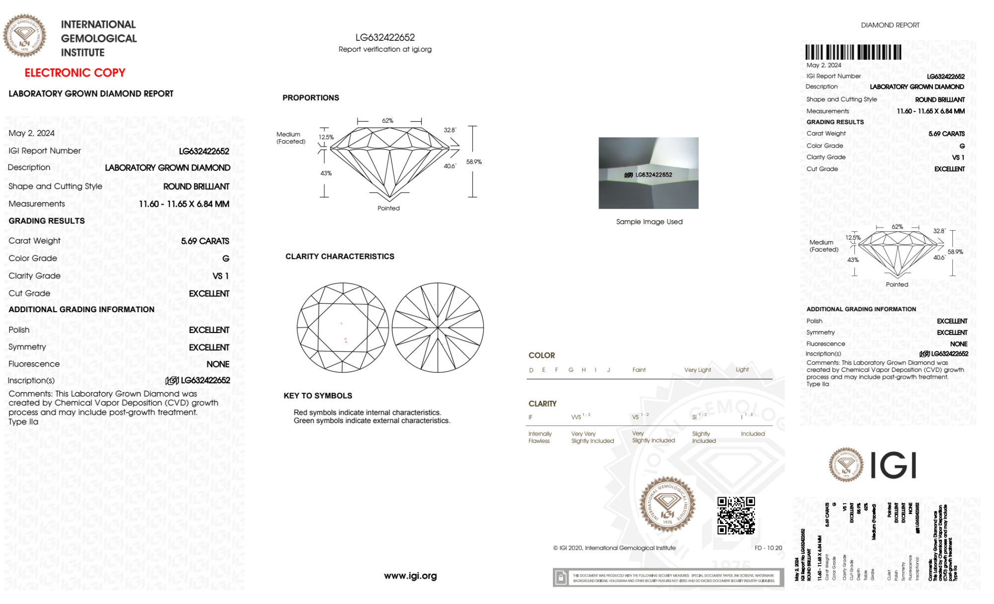 Your 5.69 carat Round lab diamond is graded VS1 clarity, which stands for Very Slightly Included 1. Read more about VS1 clarity diamonds here, or learn more about diamond clarity in general here.