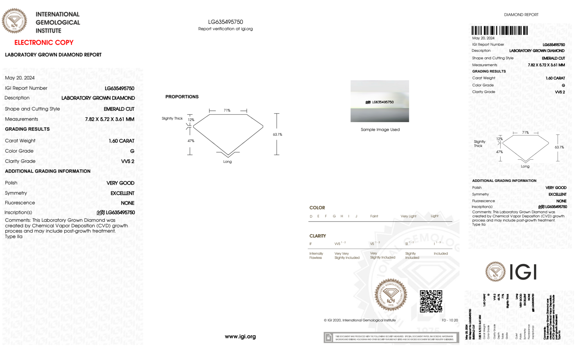Your 1.60 carat Emerald lab diamond is graded G color (Near Colorless), and you can read more about G color diamonds here.