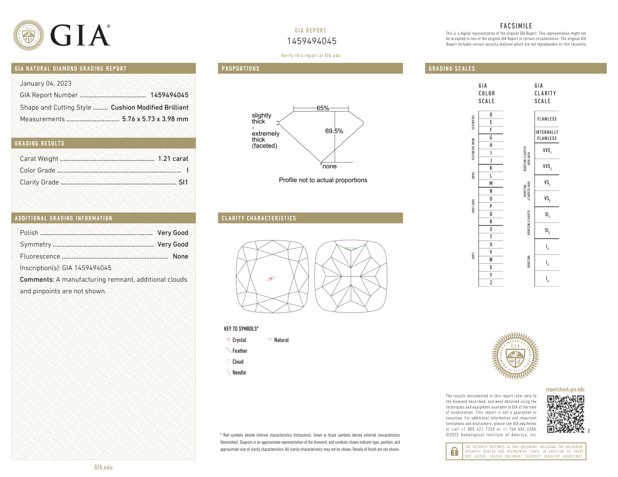 Your 1.21 carat Cushion natural diamond is graded SI1 clarity, which stands for Slightly Included 1. Read more about SI1 clarity diamonds here, or learn more about diamond clarity in general here.
