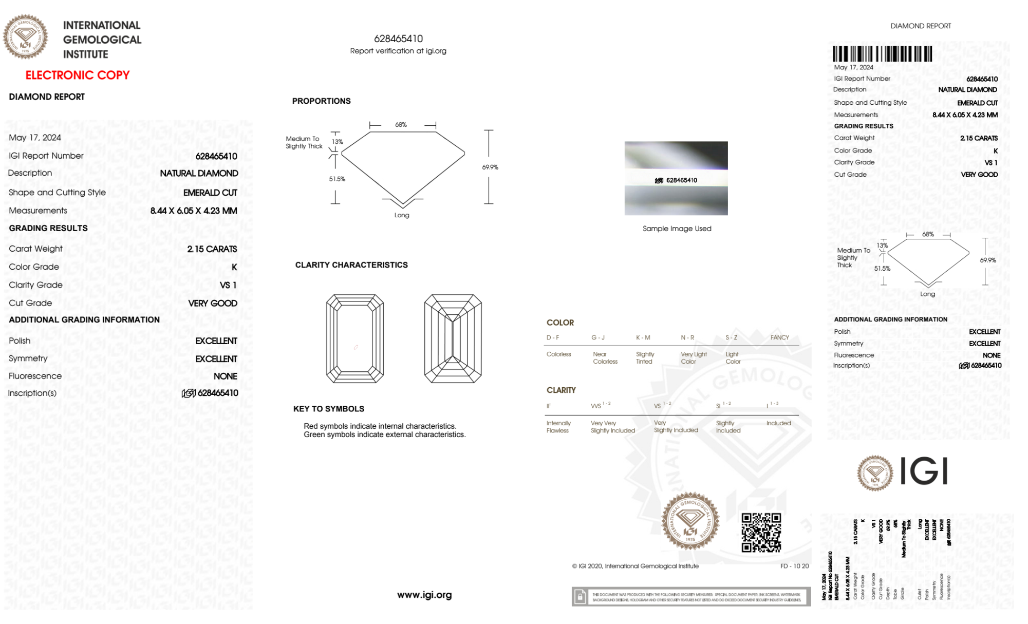 Your 2.15 carat Emerald natural diamond is graded VS1 clarity, which stands for Very Slightly Included 1. Read more about VS1 clarity diamonds here, or learn more about diamond clarity in general here.