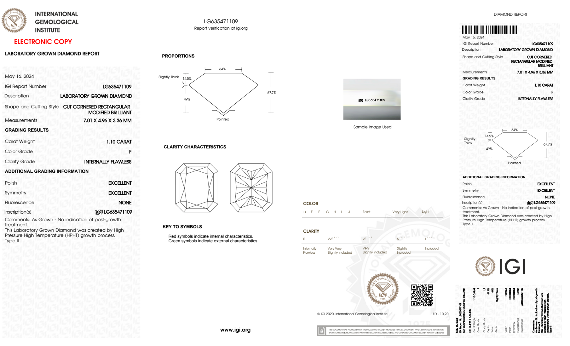 Your 1.10 carat Radiant lab diamond is graded IF clarity, which stands for Internally Flawless. Read more about IF clarity diamonds here, or learn more about diamond clarity in general here.