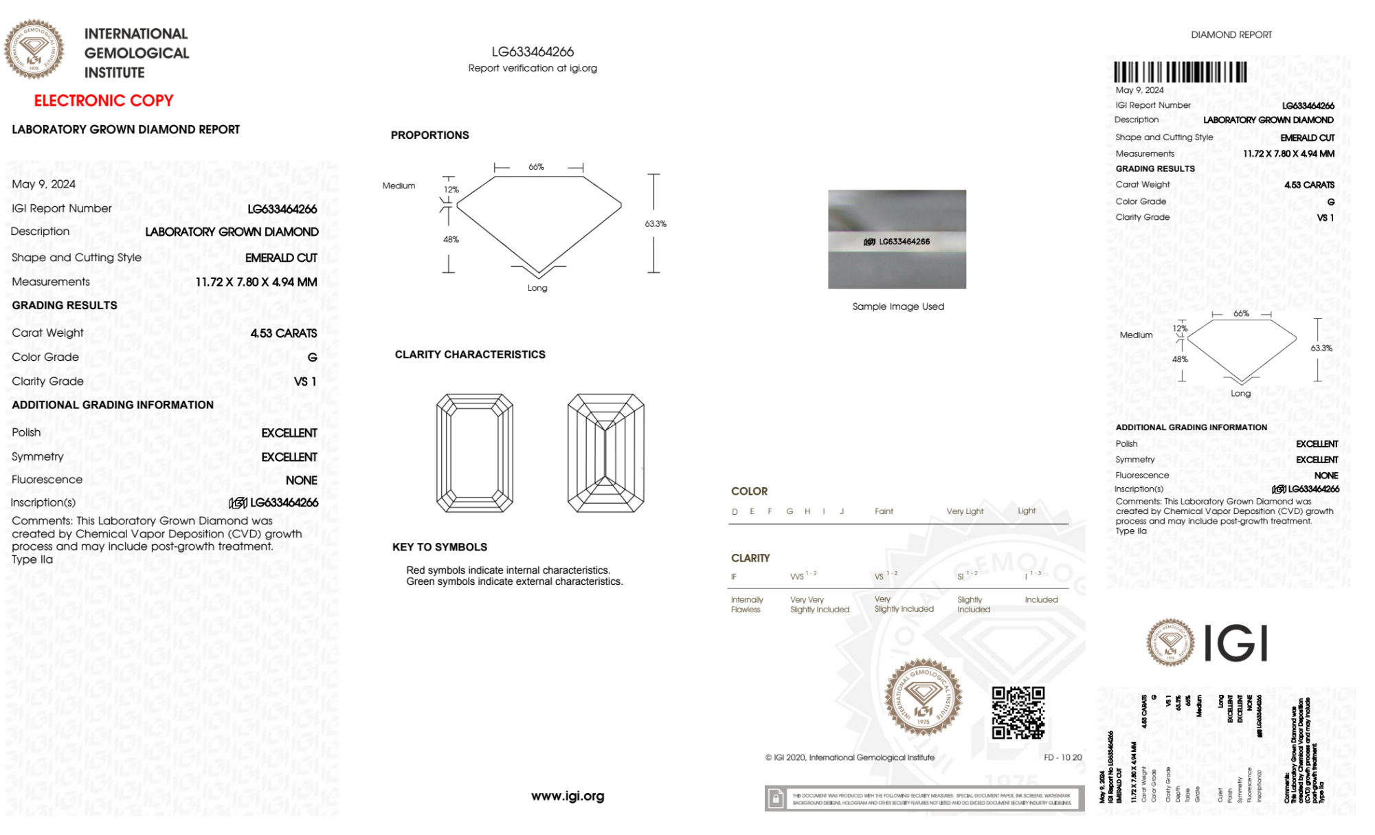 Your 4.53 carat Emerald lab diamond is graded G color (Near Colorless), and you can read more about G color diamonds here.