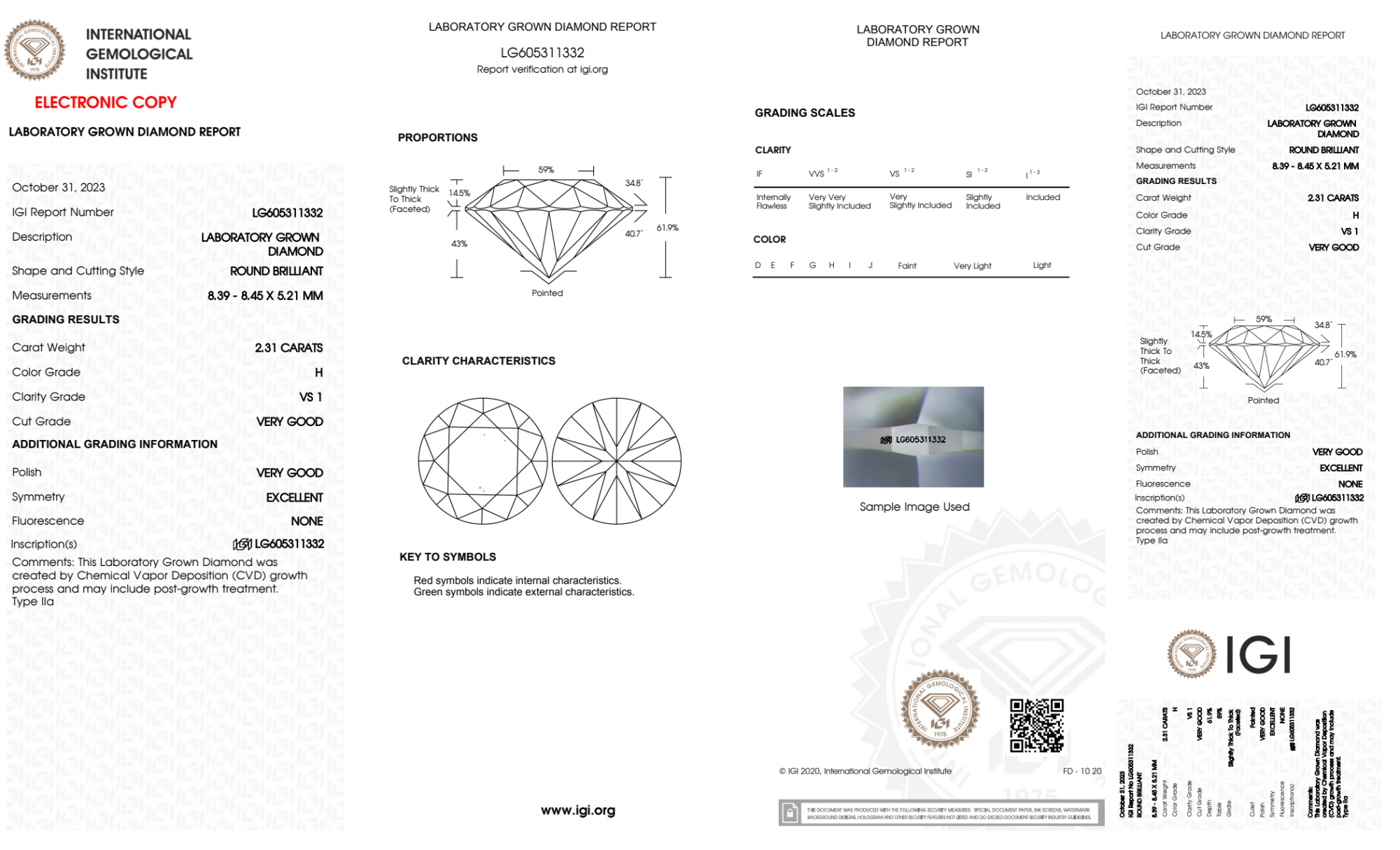 Your 2.31 carat Round lab diamond is graded H color (Near Colorless), and you can read more about H color diamonds here.