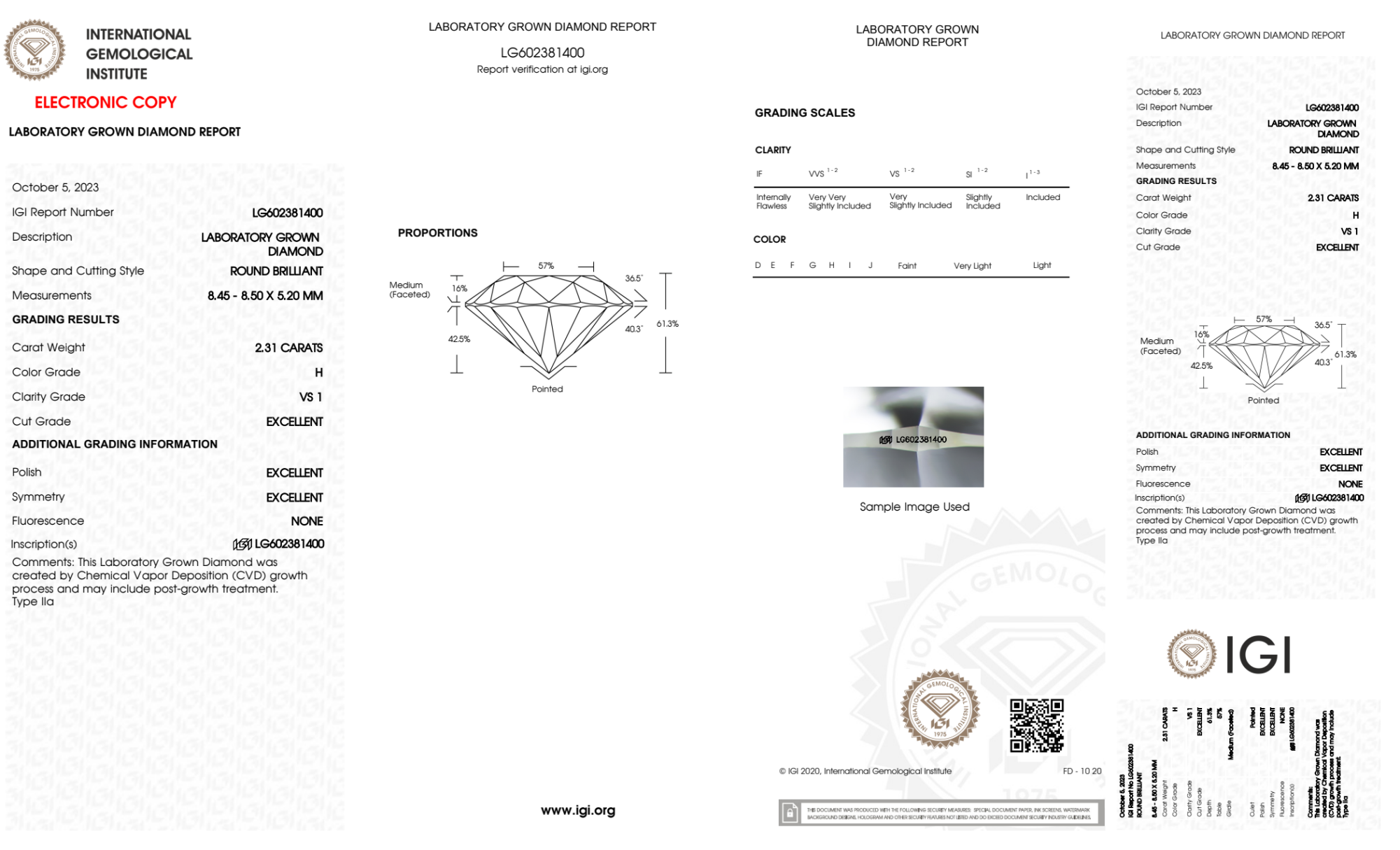 Your 2.31 carat Round lab diamond is graded H color (Near Colorless), and you can read more about H color diamonds here.